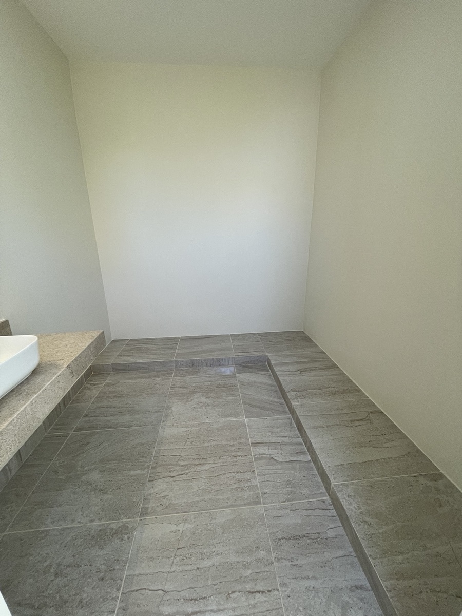 • TRAVERTINO FIORITO BRILLADO marble countertops in bathrooms.