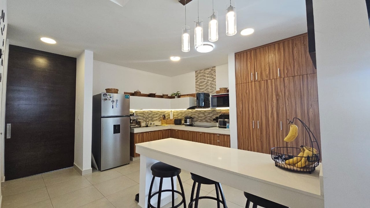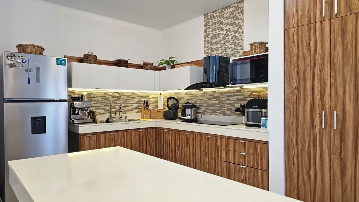 - Cocina vestida con gavetas superiores e inferiores, campana y parrilla de inducción eléctrica. Cuenta además con una barra de meseta de cuarzo