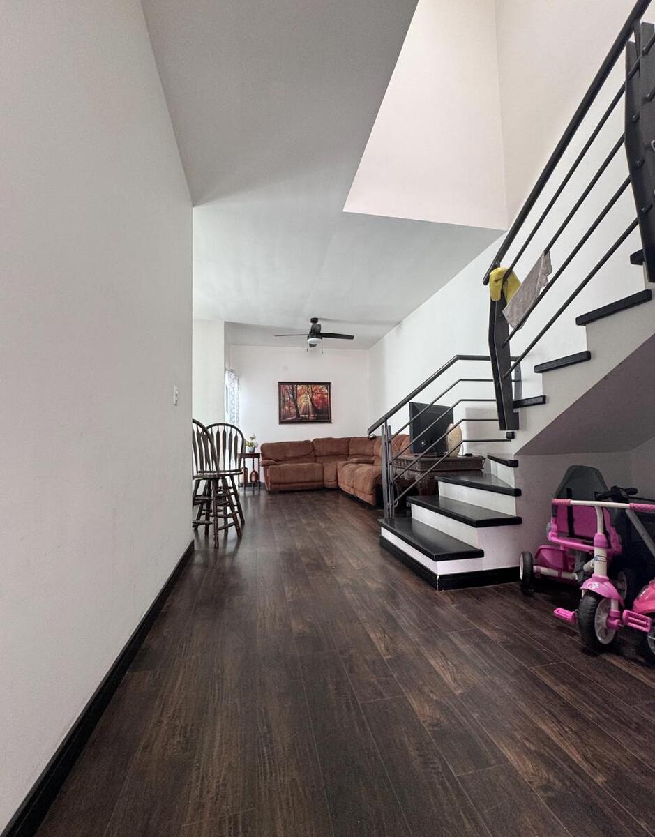 Patio frontal con portón eléctrico para estacionar dos vehículos grandes y acceso peatonal independiente.