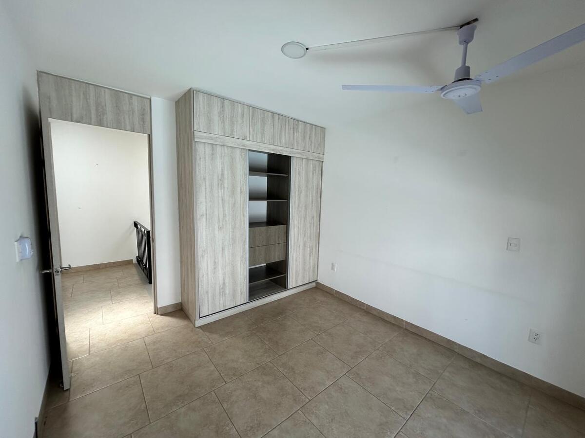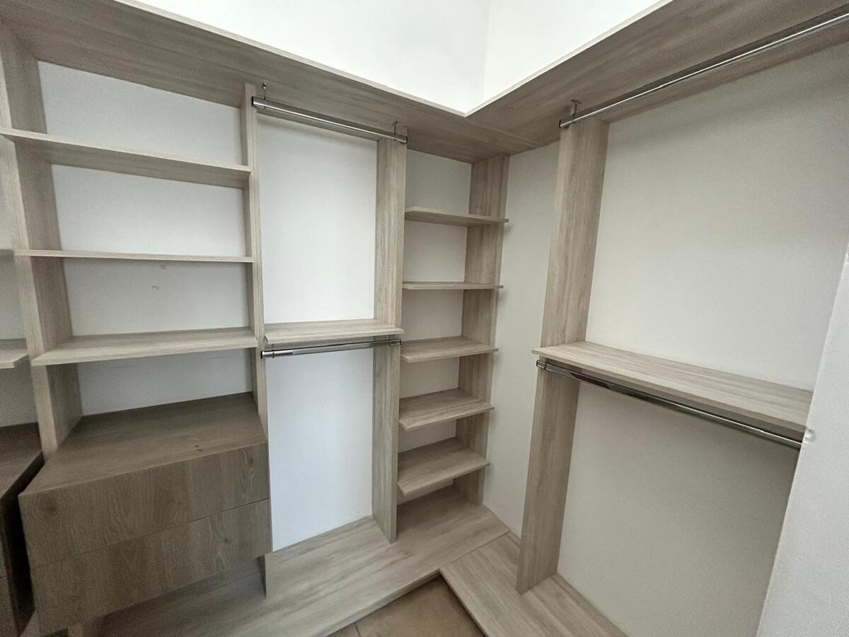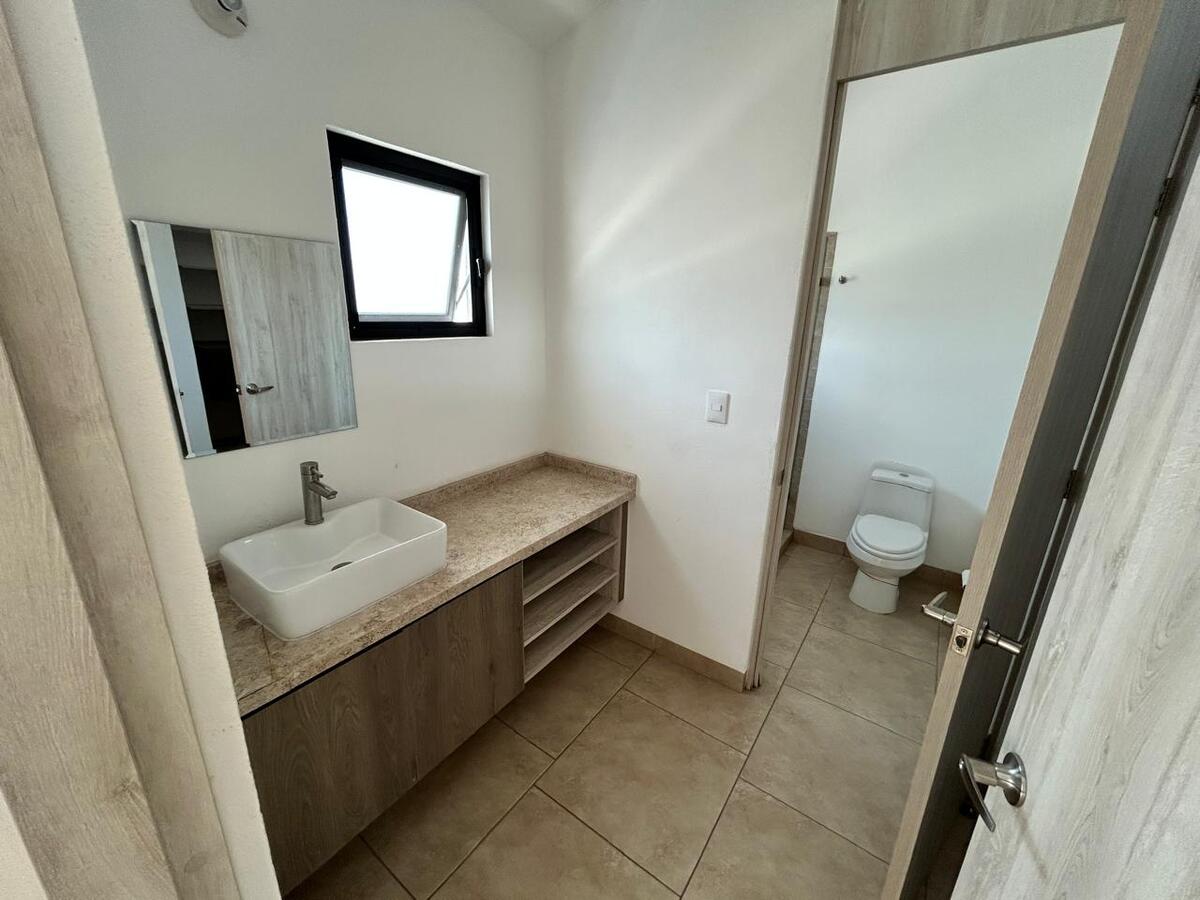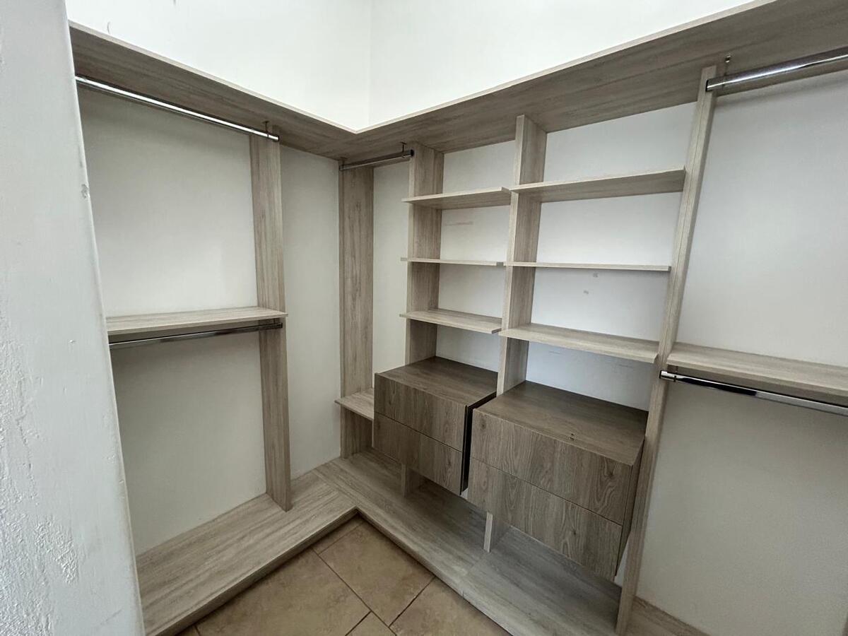 La recámara principal ofrece privacidad con walk-in closet y baño completo con cancelería de vidrio templado. Dos recámaras secundarias, cada una con closet, comparten un baño completo y cuentan con balcones decorativos que aportan luz y estilo.
