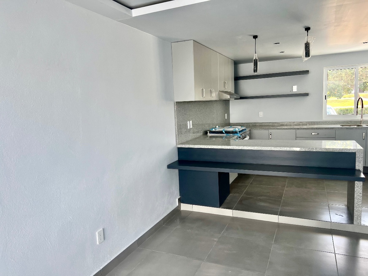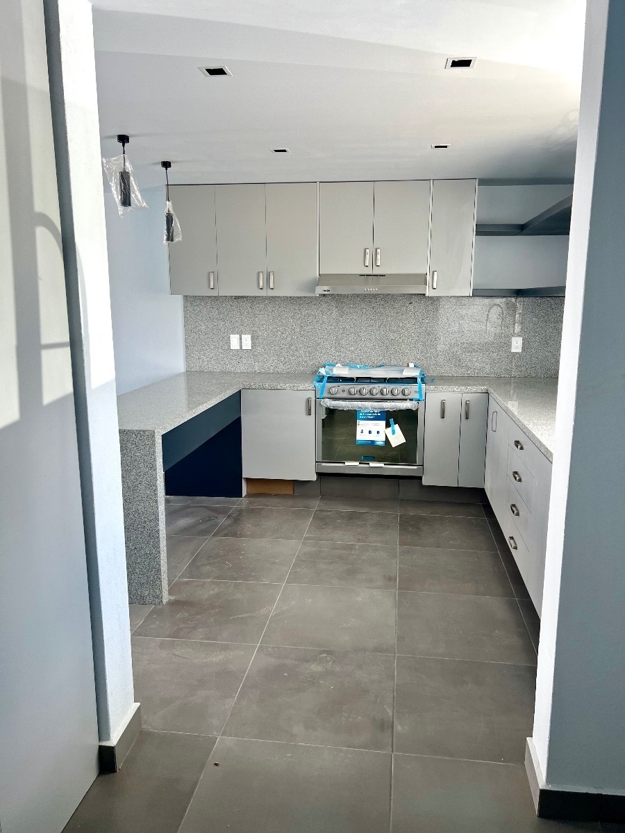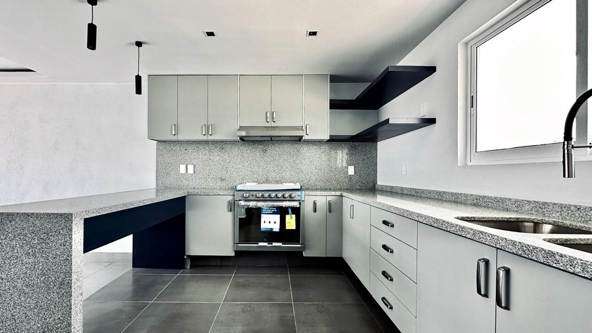 Cochera para dos autos, cocina súper equipada con estufa y campana.