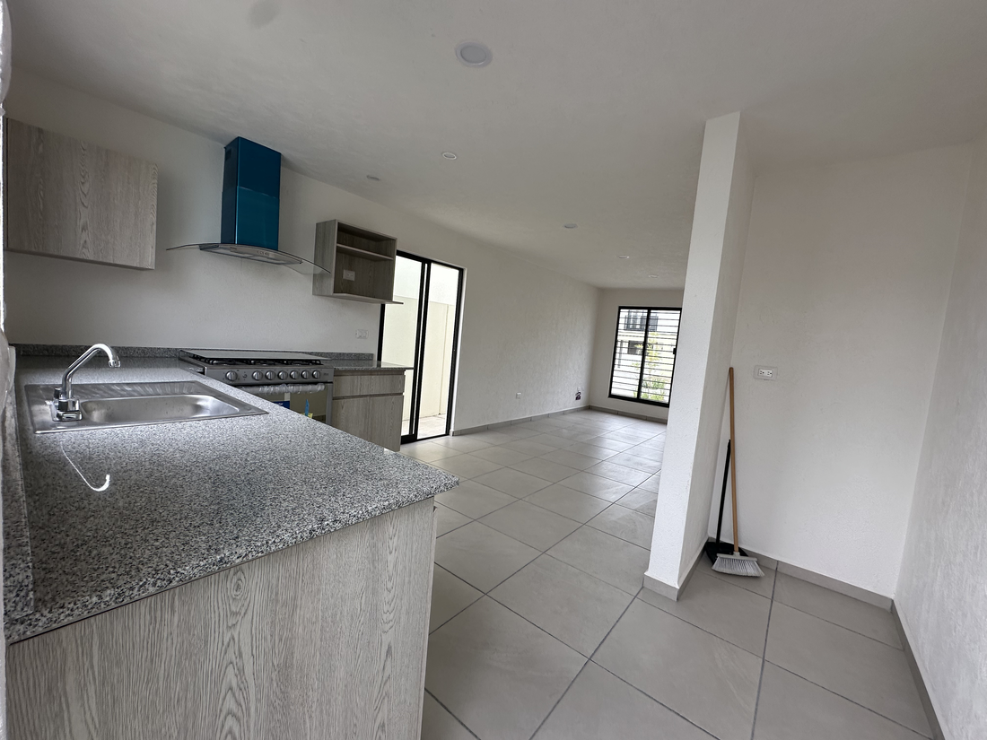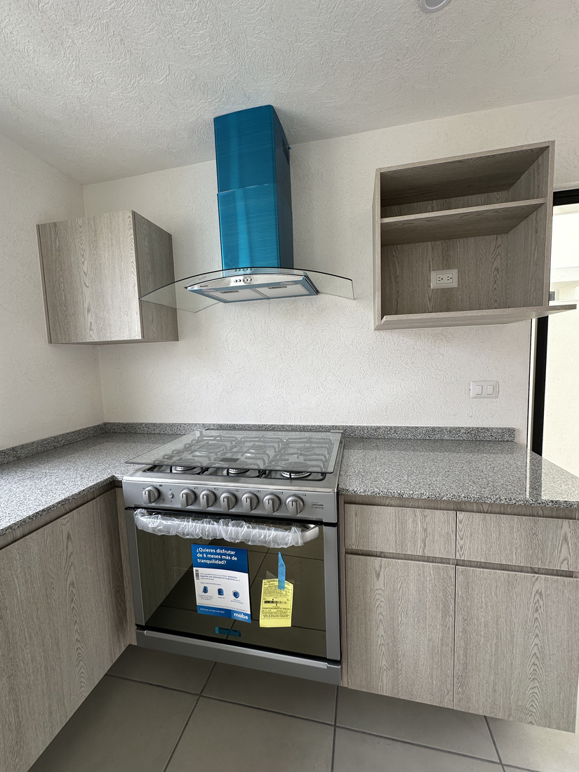 * Cocina integral con cubierta de granito y campana azul.