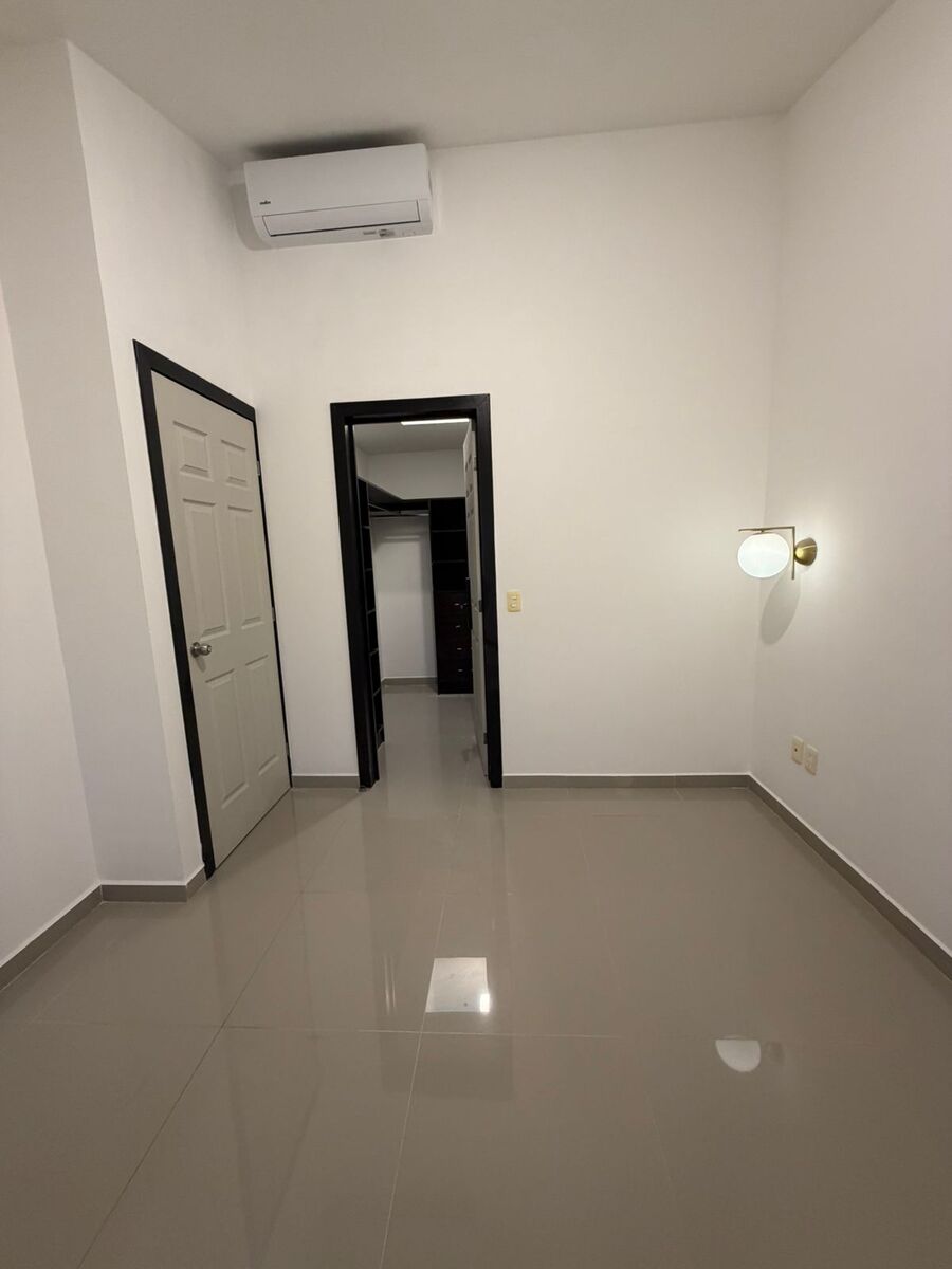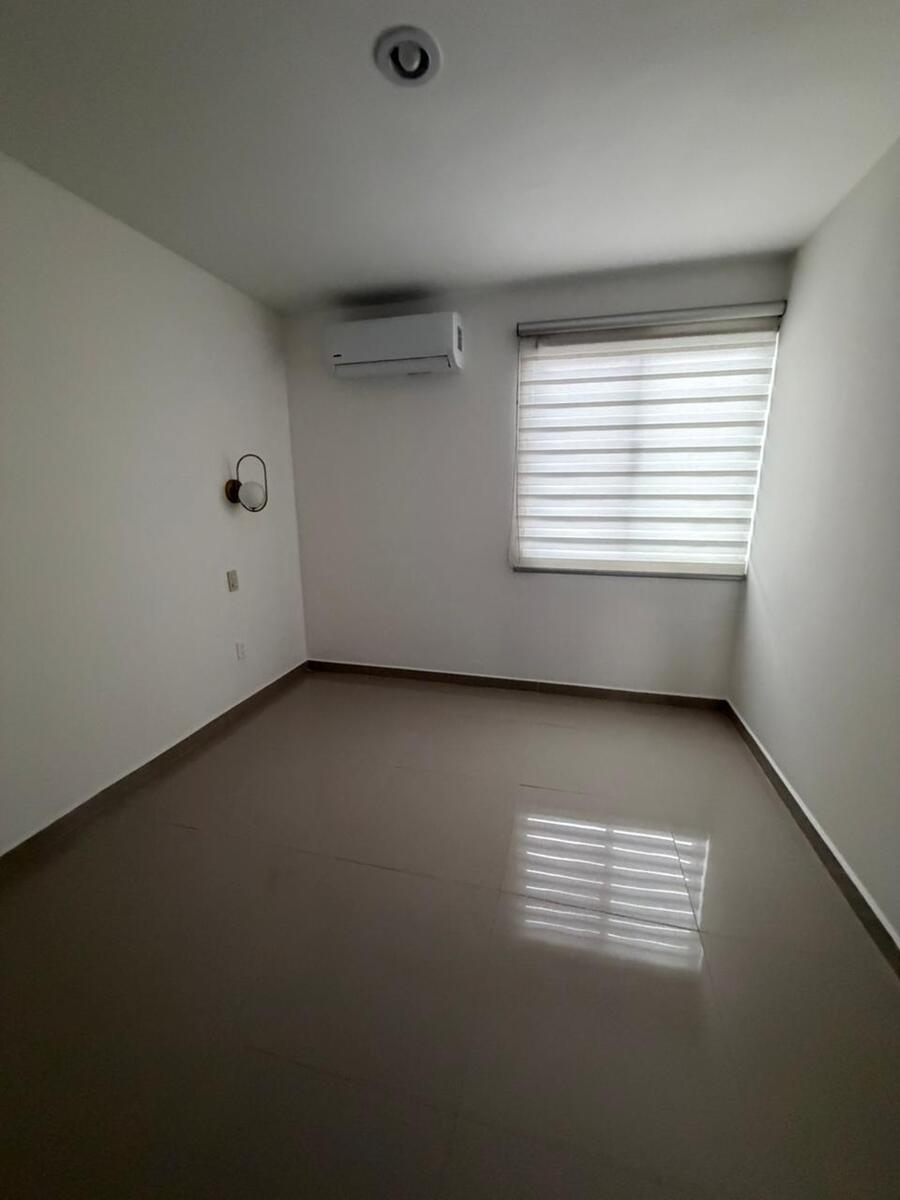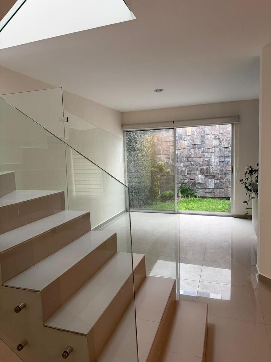 Cocina con barra cubierta de granito, recámara principal con baño y vestidor, la secundaría con closet y baño, la tercera con closet, todas cuentan con aire acondicionado amplio distribuidor con closet en planta alta, baños con cubierta de mármol, cristal en puertas, escalera con barandal de cristal, jardín interior, cuarto de lavado, vigilancia, áreas comunes, terraza, pequeña alberca.