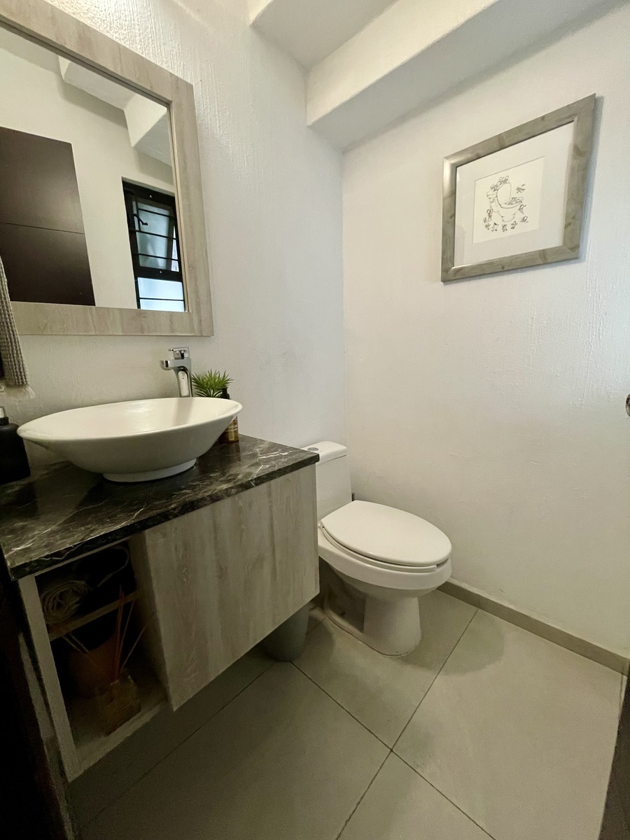 cuenta con medio baño social, cuarto de lavado cerrado y bodega en el área de cochera, estacionamientos para dos autos.
