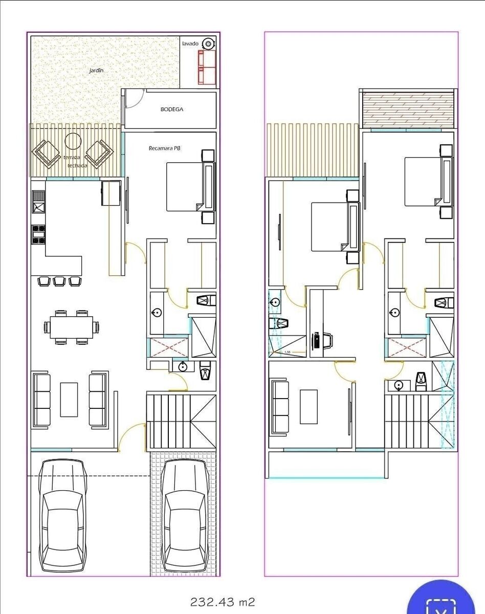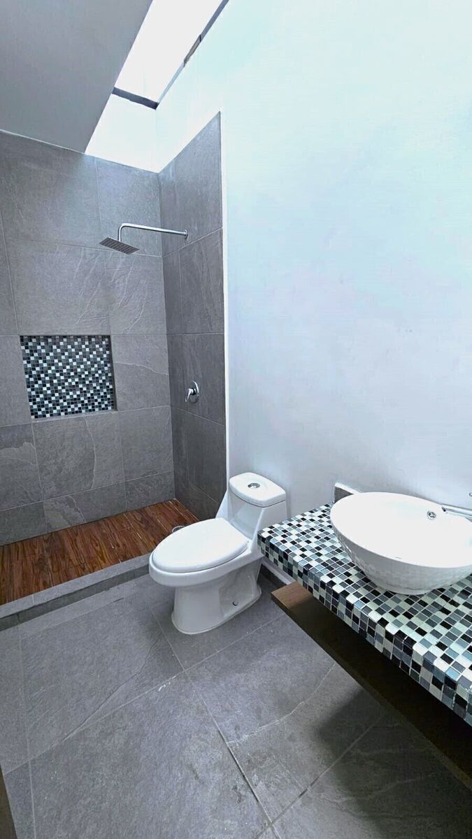 - 4 habitaciones con baño completo (2 recámaras principales gemelas con vestidor y baño, una en PB y otra en PA).