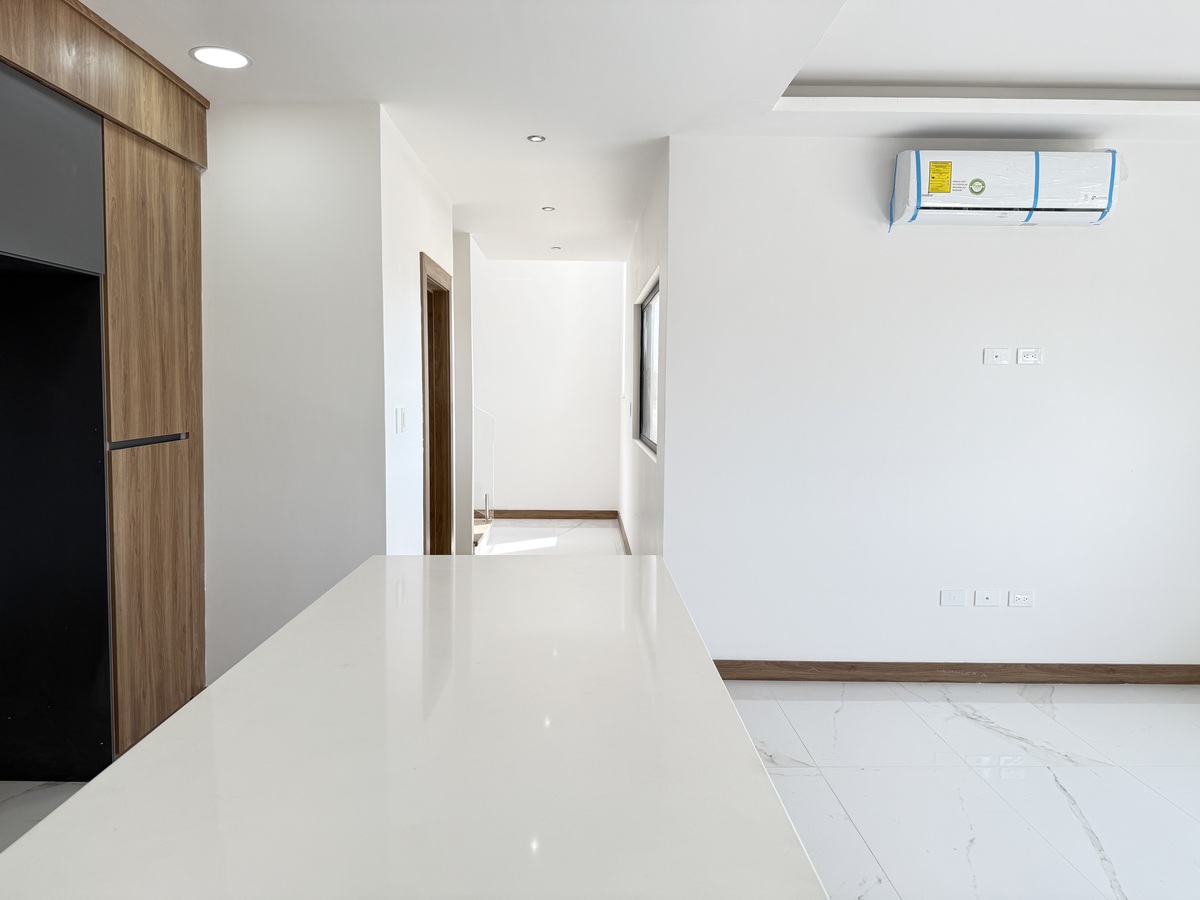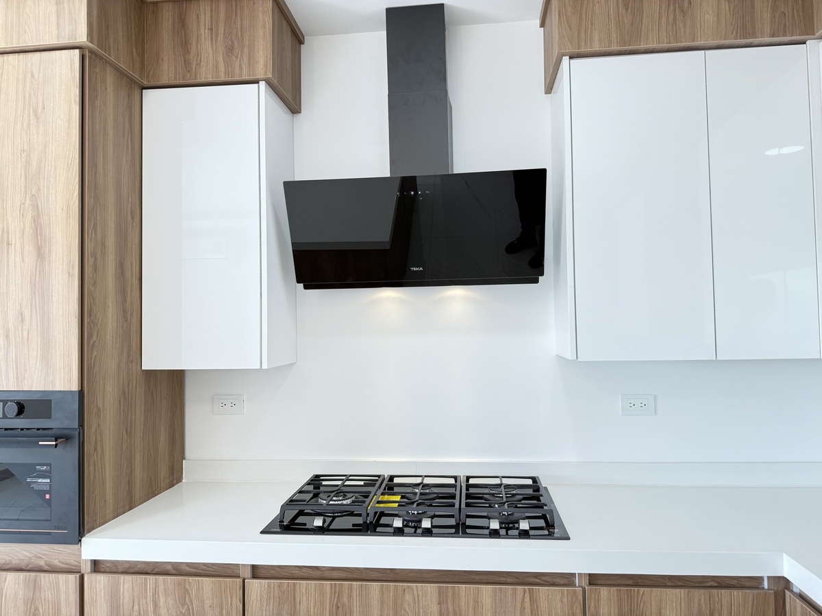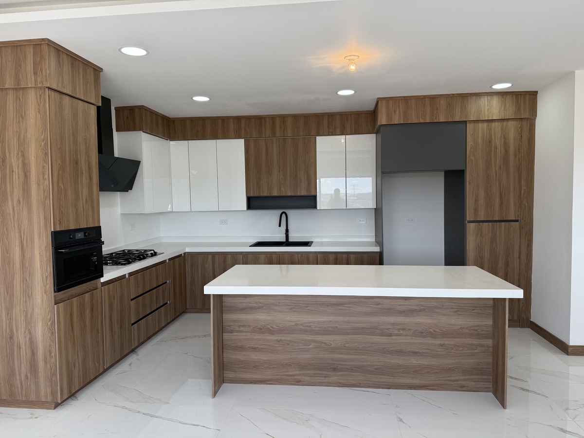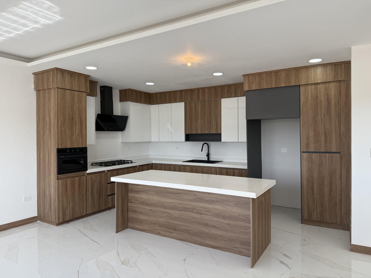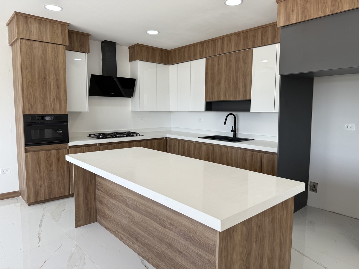 - Cocina de melamina, con cubierta de cuarzo blanco