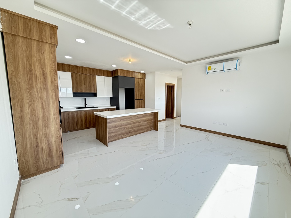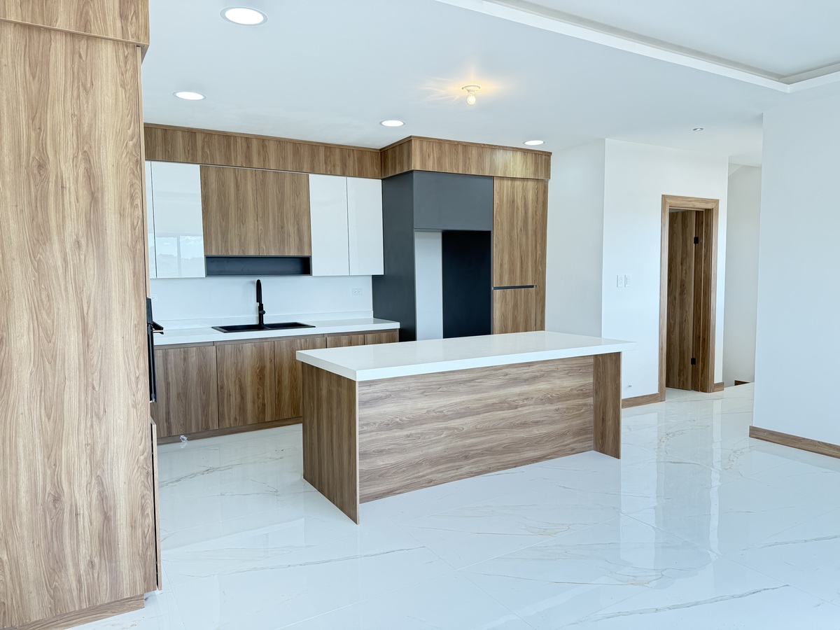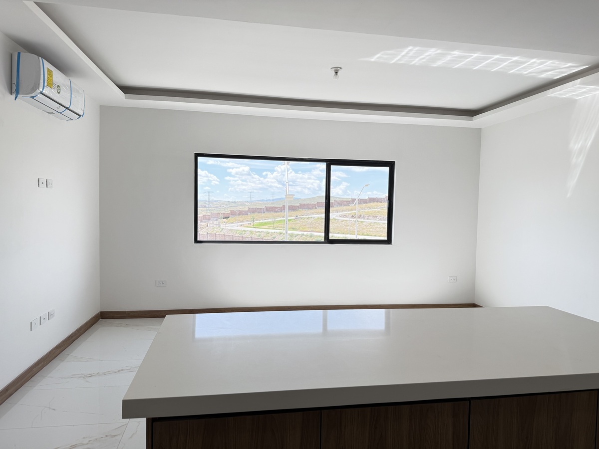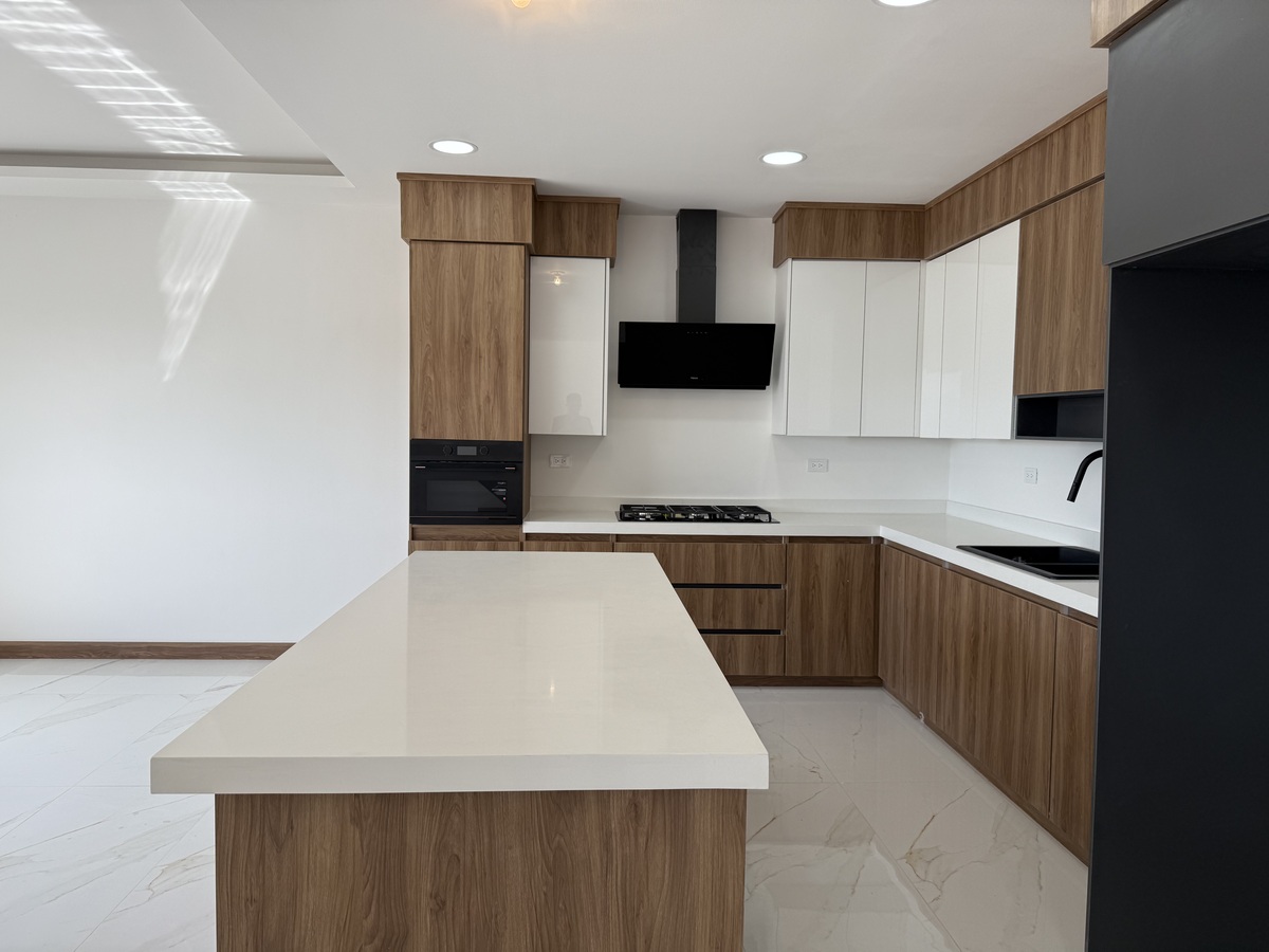 - Cocina de melamina, con cubierta de cuarzo blanco