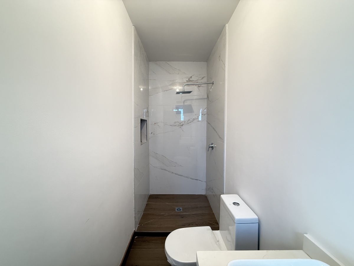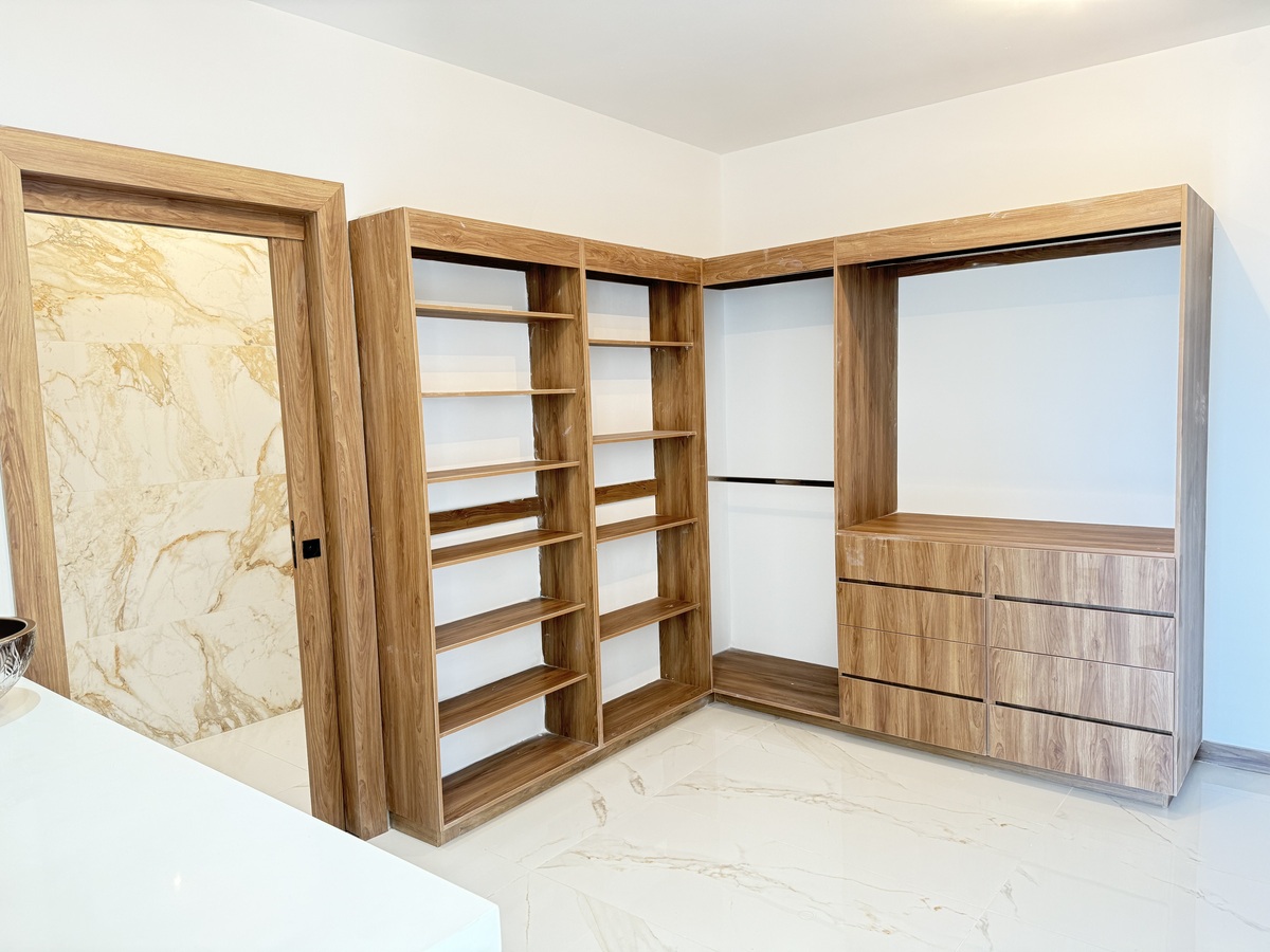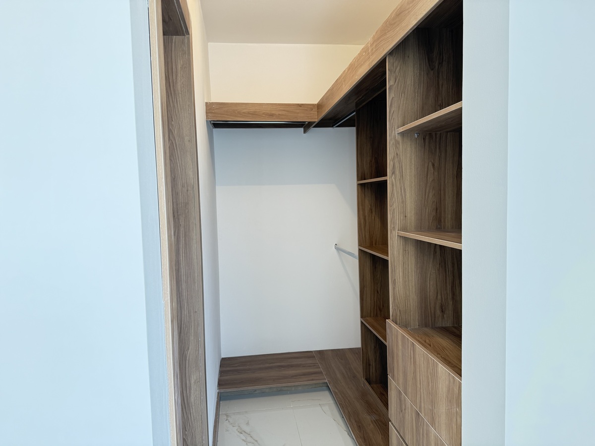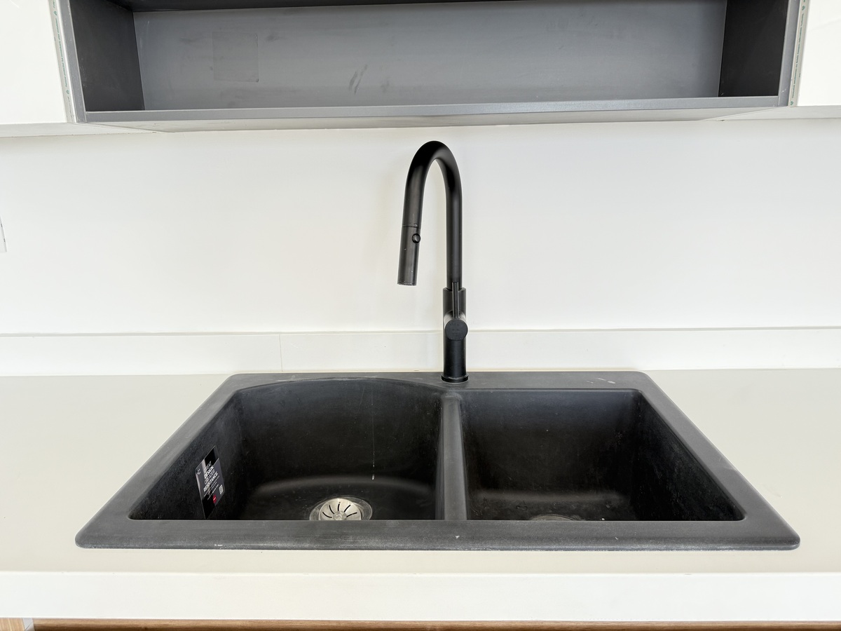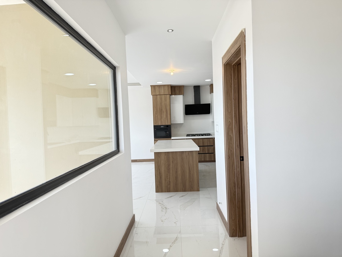 - Cocina de melamina, con cubierta de cuarzo blanco