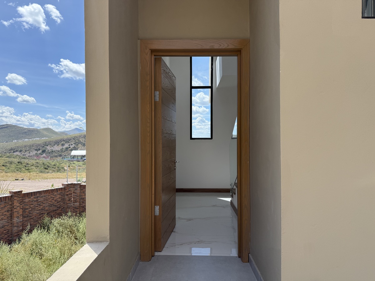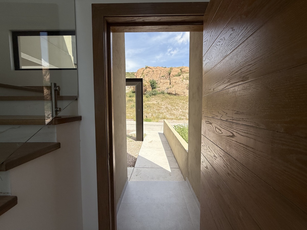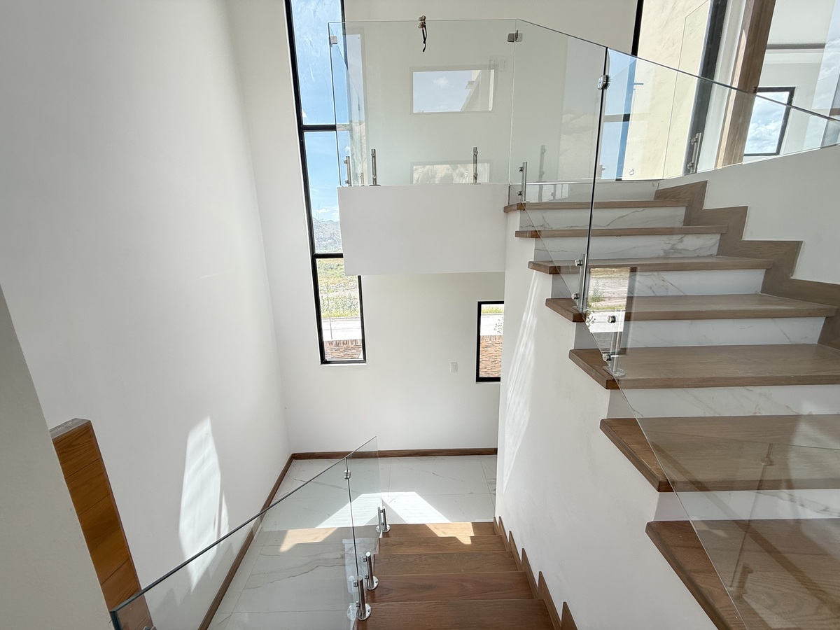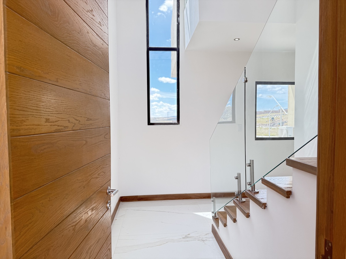 - Carpintería de encino sólido en puerta principal y huellas de escalera.