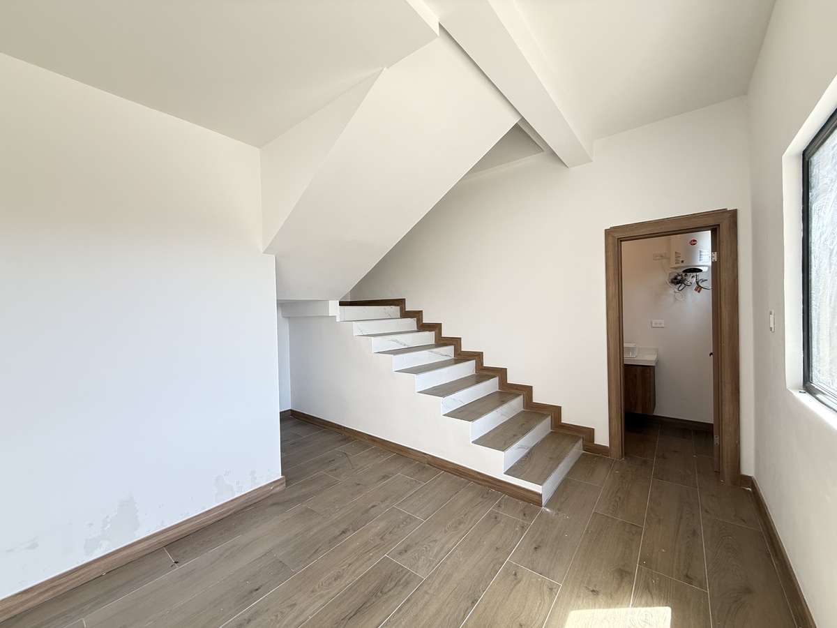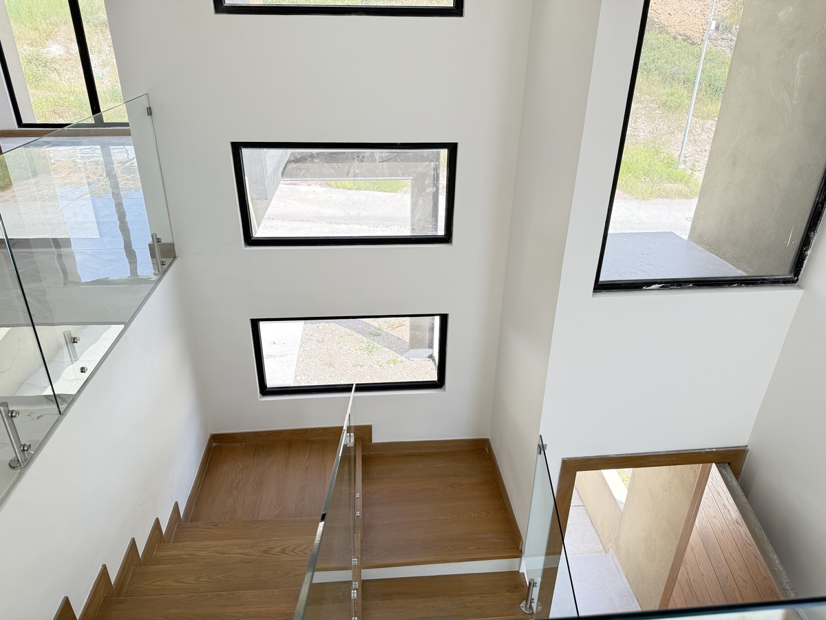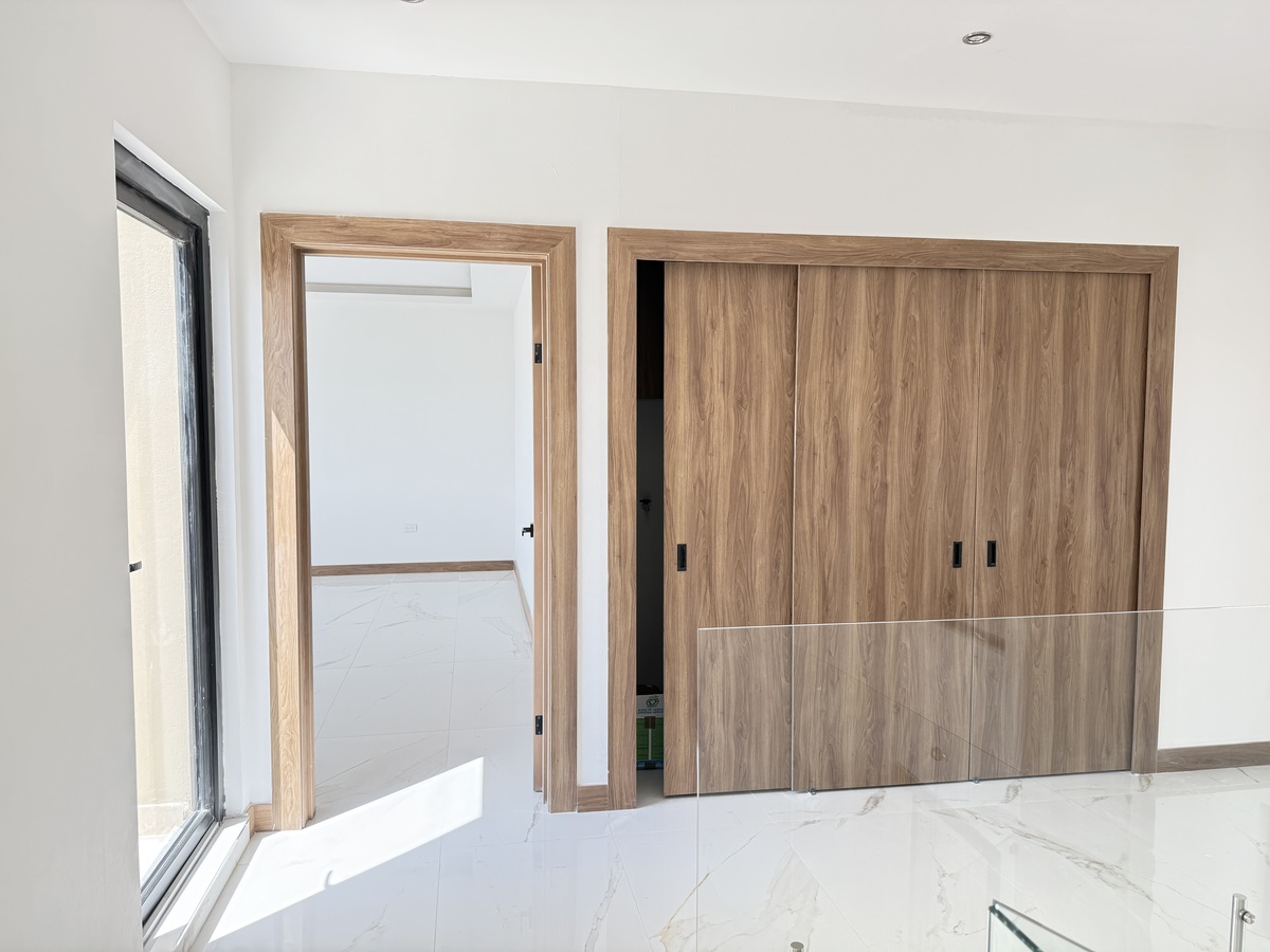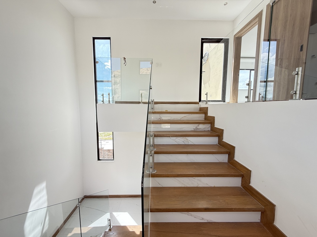 - Carpintería de encino sólido en puerta principal y huellas de escalera.