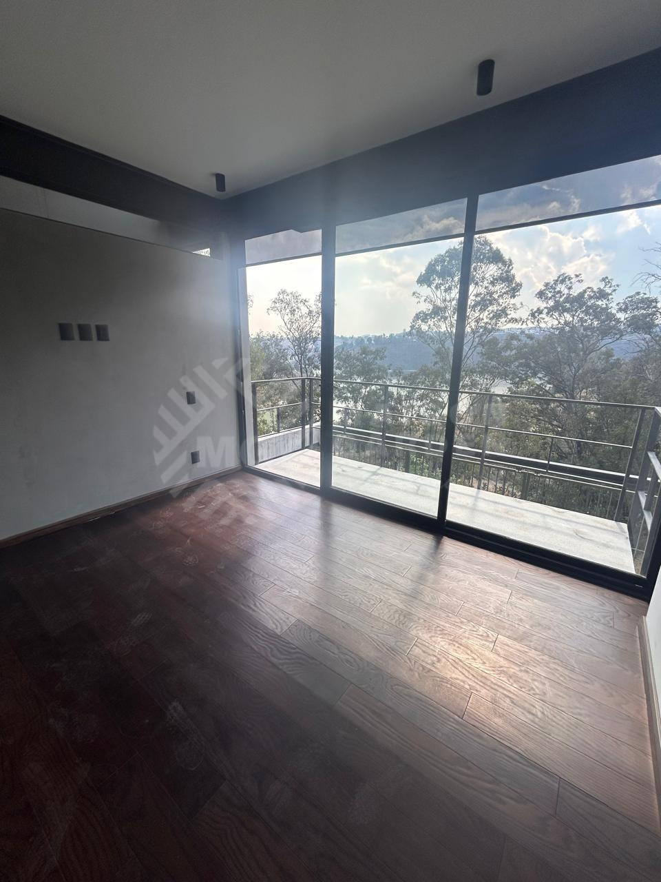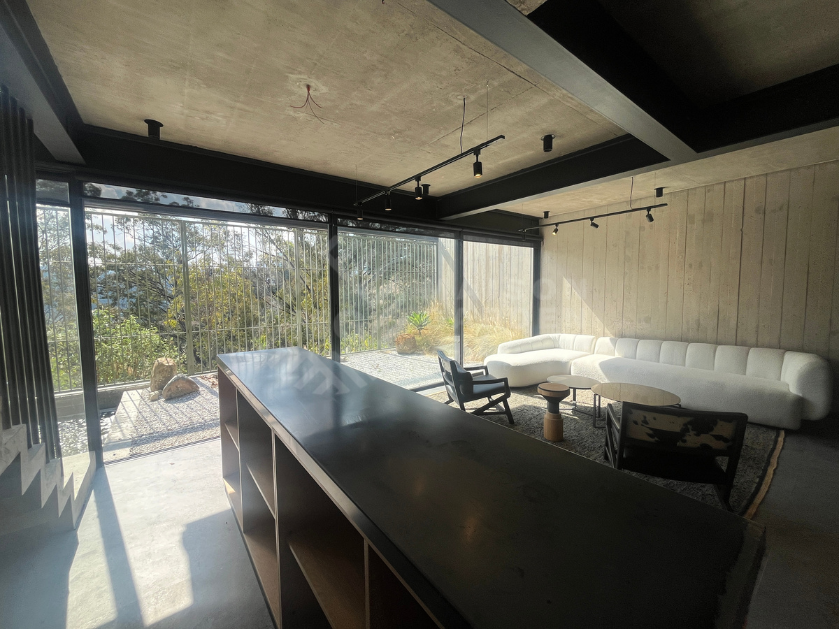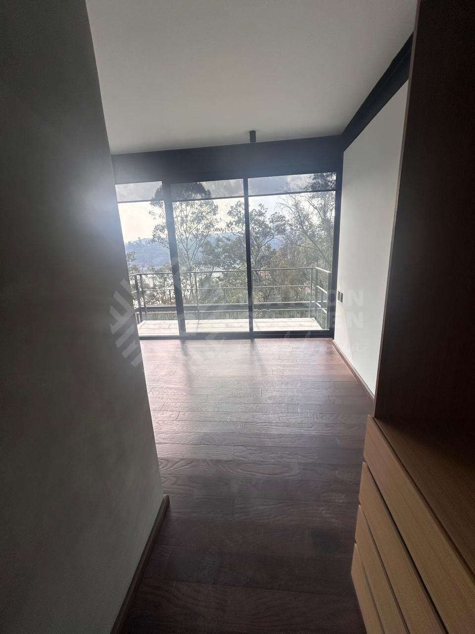 En el nivel superior tenemos un pasillo de doble altura que nos comunica al área privada encontrandonos con una sala de T.V. y a su lado una recámara ambas con vistas a la presa Madín.