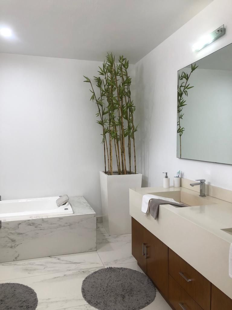 Lavabos de mármol, canceles de cristal templado en baños, aire acondicionado en recámaras, hidroneumático y cisterna.
