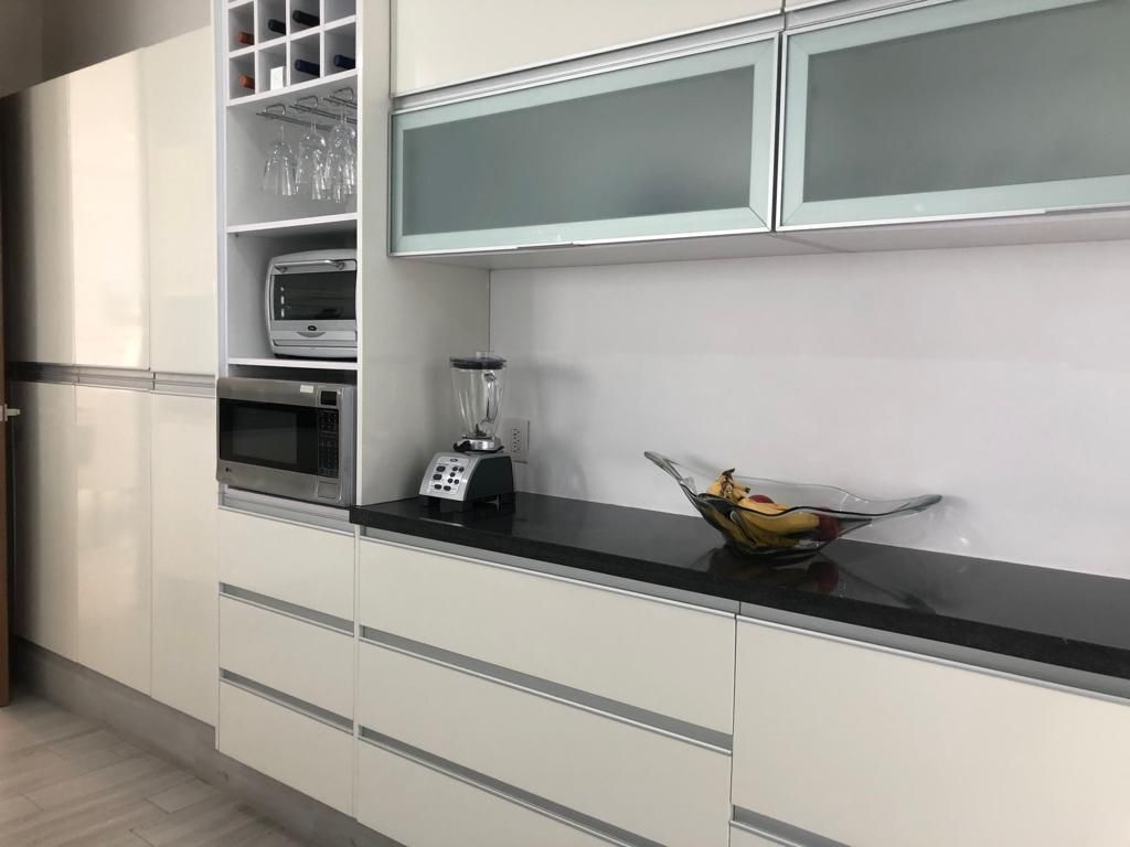 Cocina integral equipada color blanco, con cubierta de granito y lavavajillas.