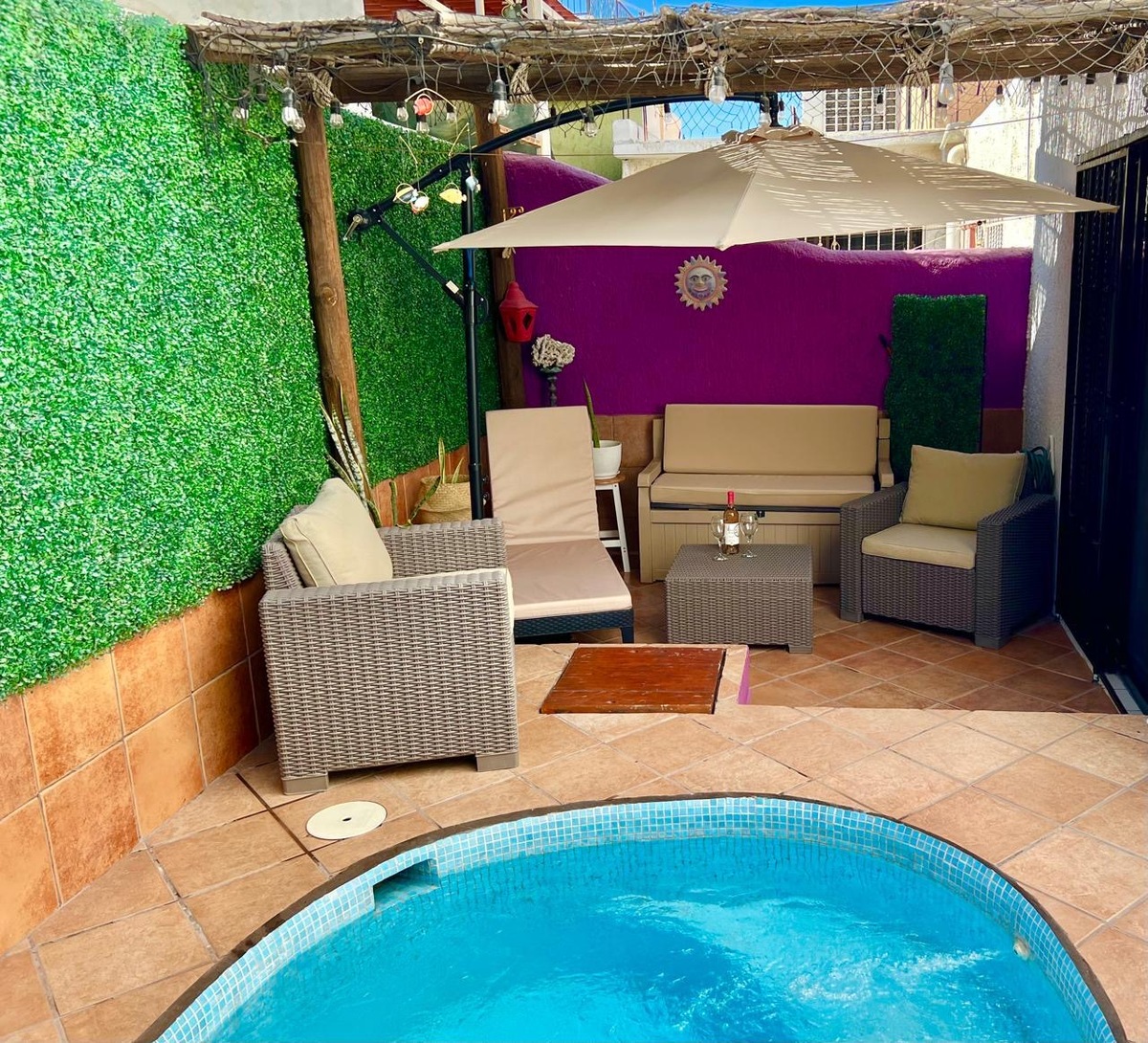 - Patio posterior con piscina y palapa