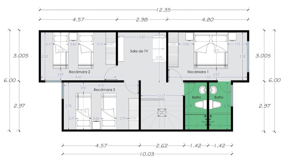 🟩 3 recámaras (la principal con baño propio; 2 comparten baño)