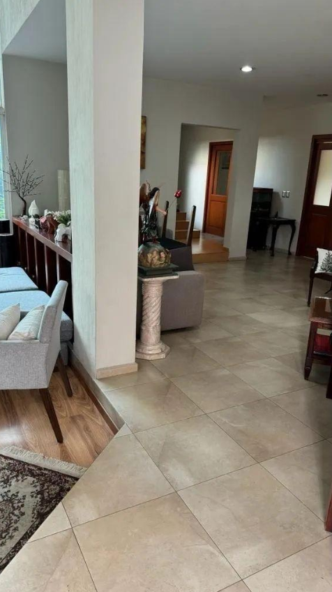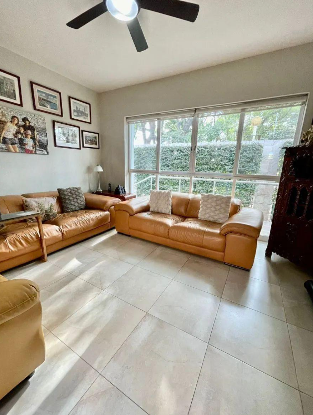 Sala con vista a un patio interno, estudio, terraza techada, medio baño y sala de TV, alberca junto a la terraza y baño completo que da servicio a la alberca, cuarto de maquinas y paneles solares para calentar la alberca, cocina integral, cuarto de lavado y patio de tender, cuarto de servicio con baño completo.