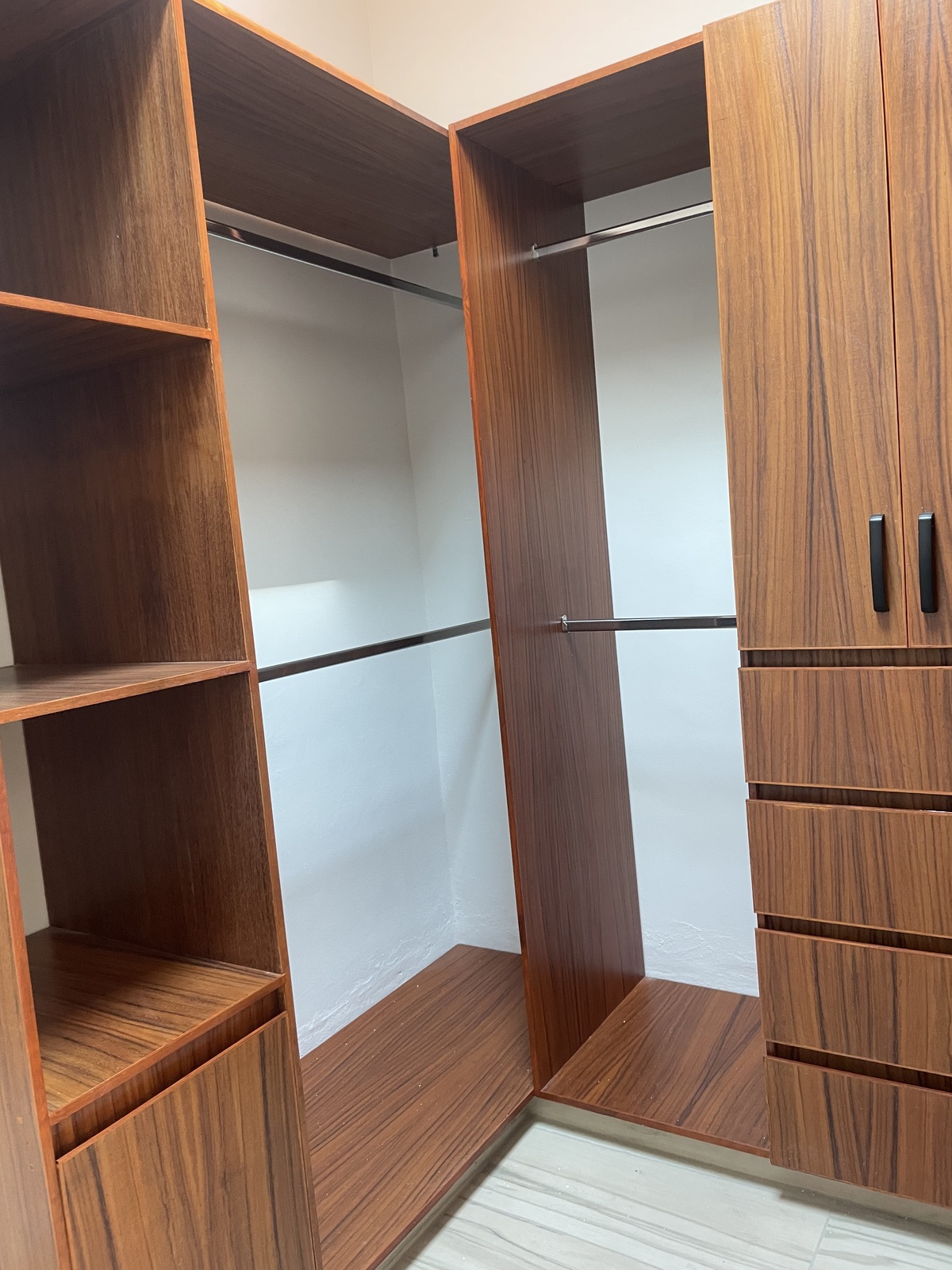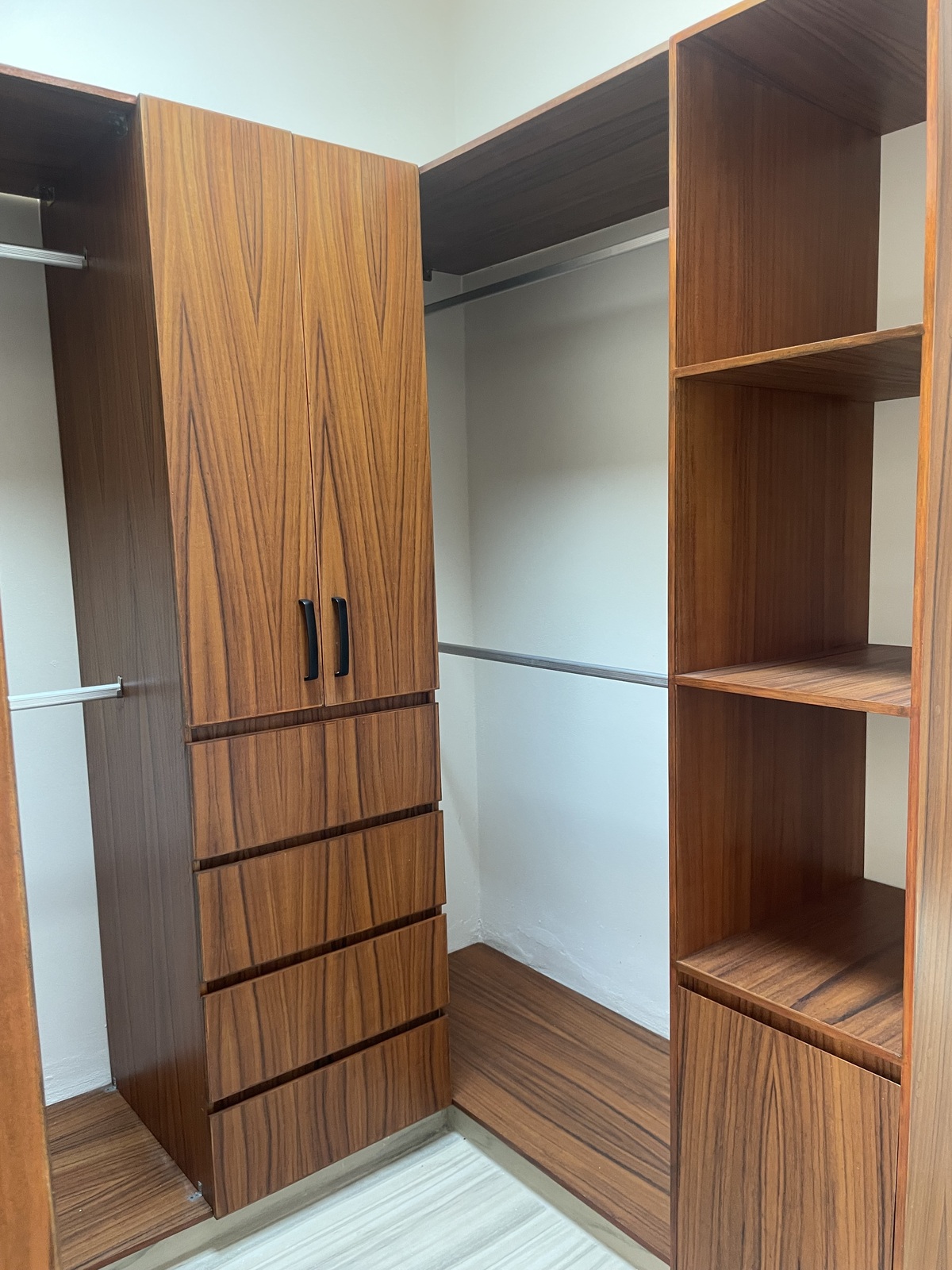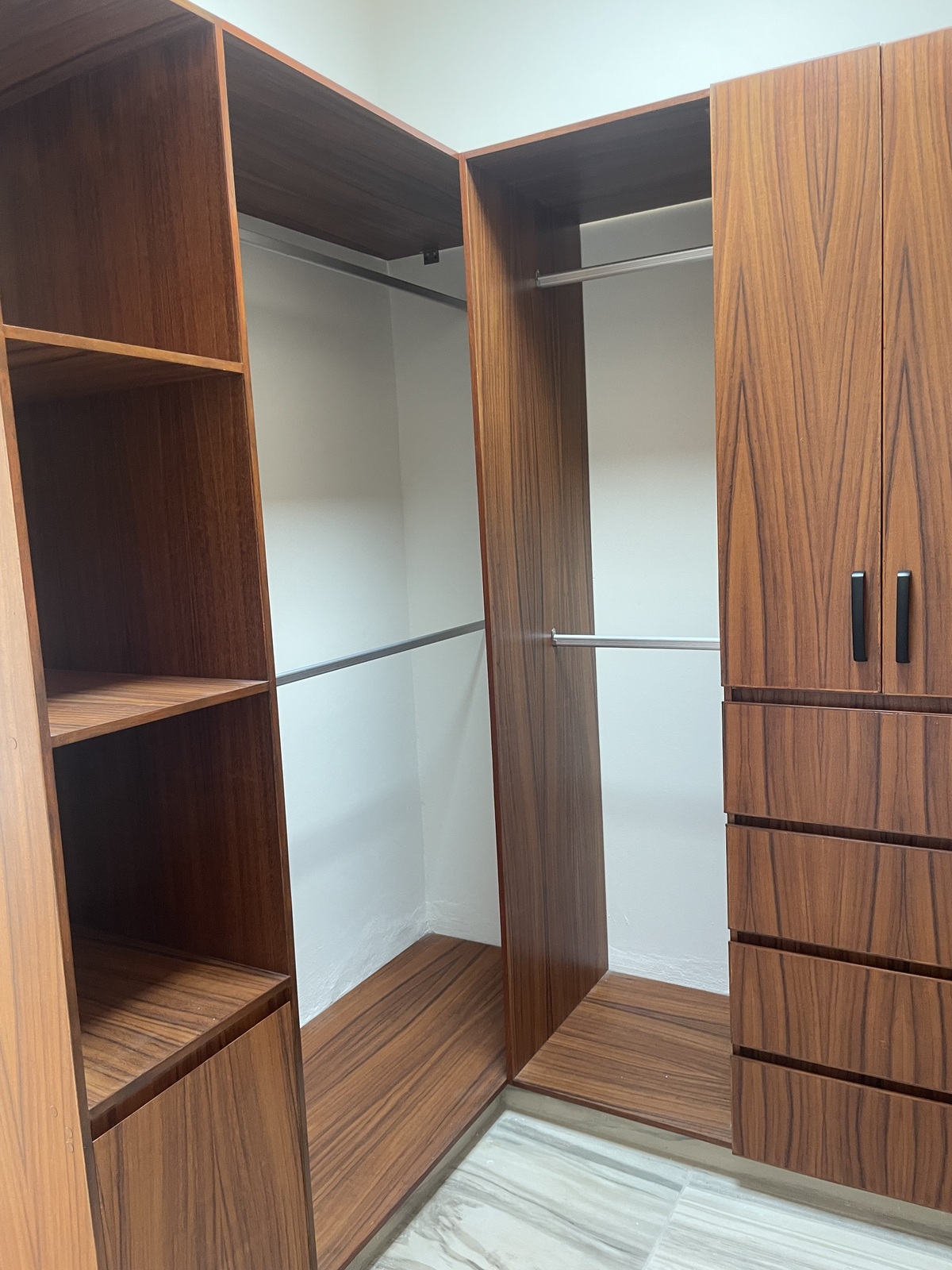 Kitchen, staircase, bedroom with walk-in closet and bathroom.