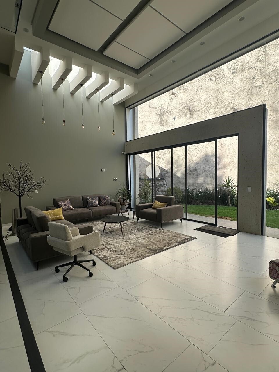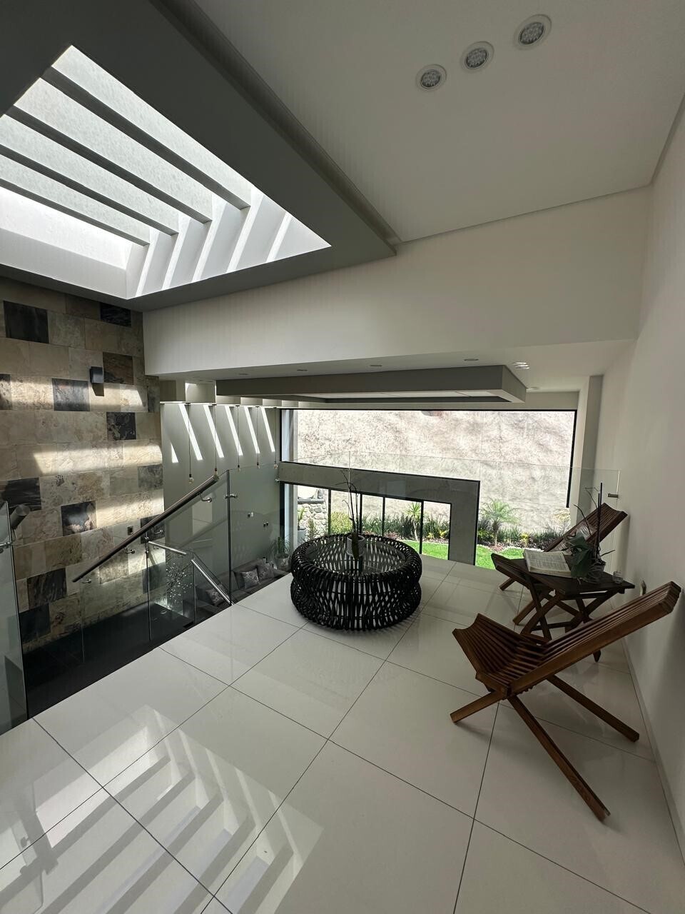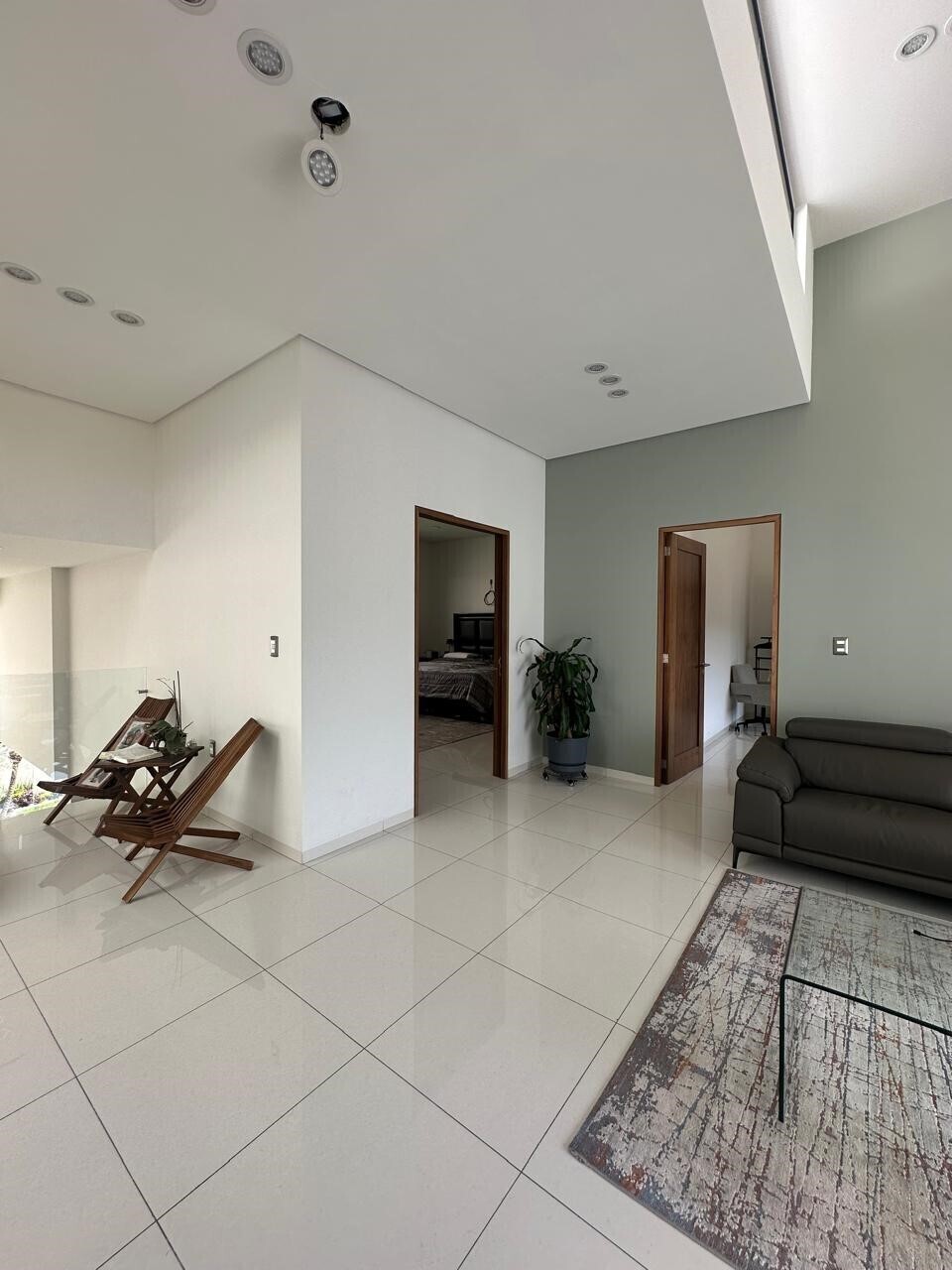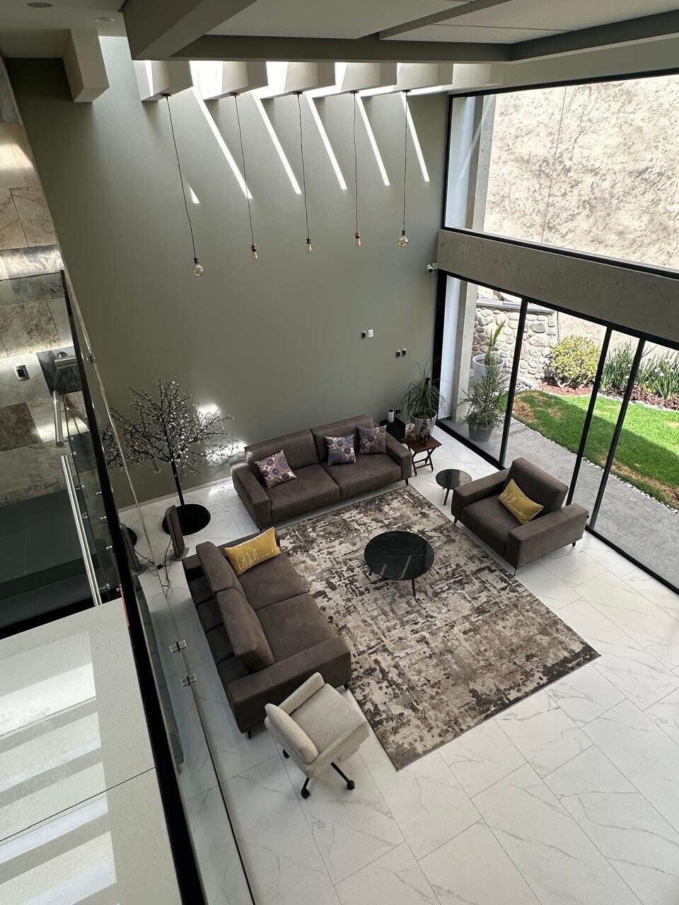 Double-height ceilings in the living room, kitchen, and staircase.
