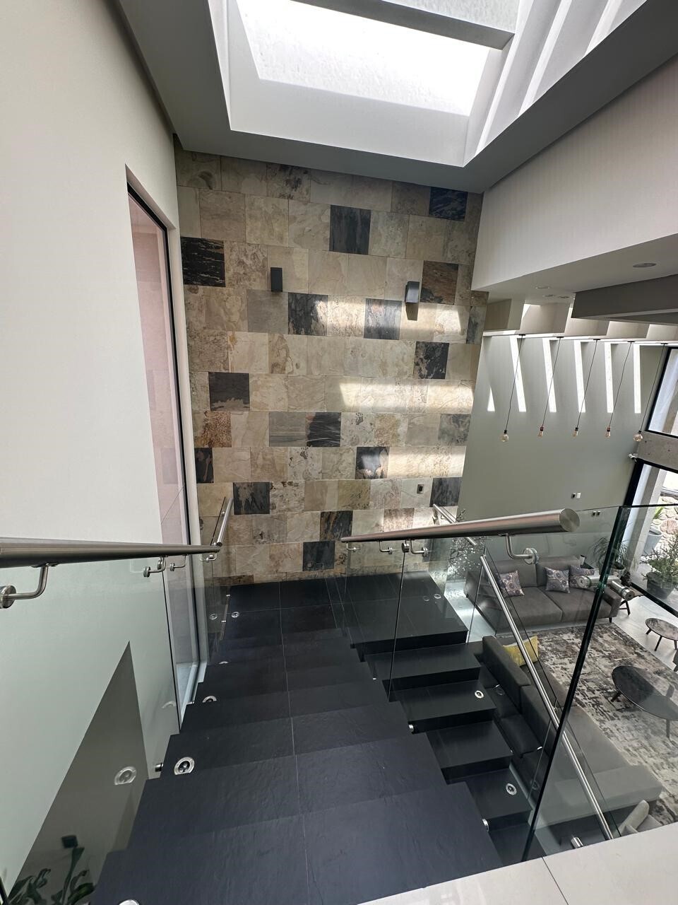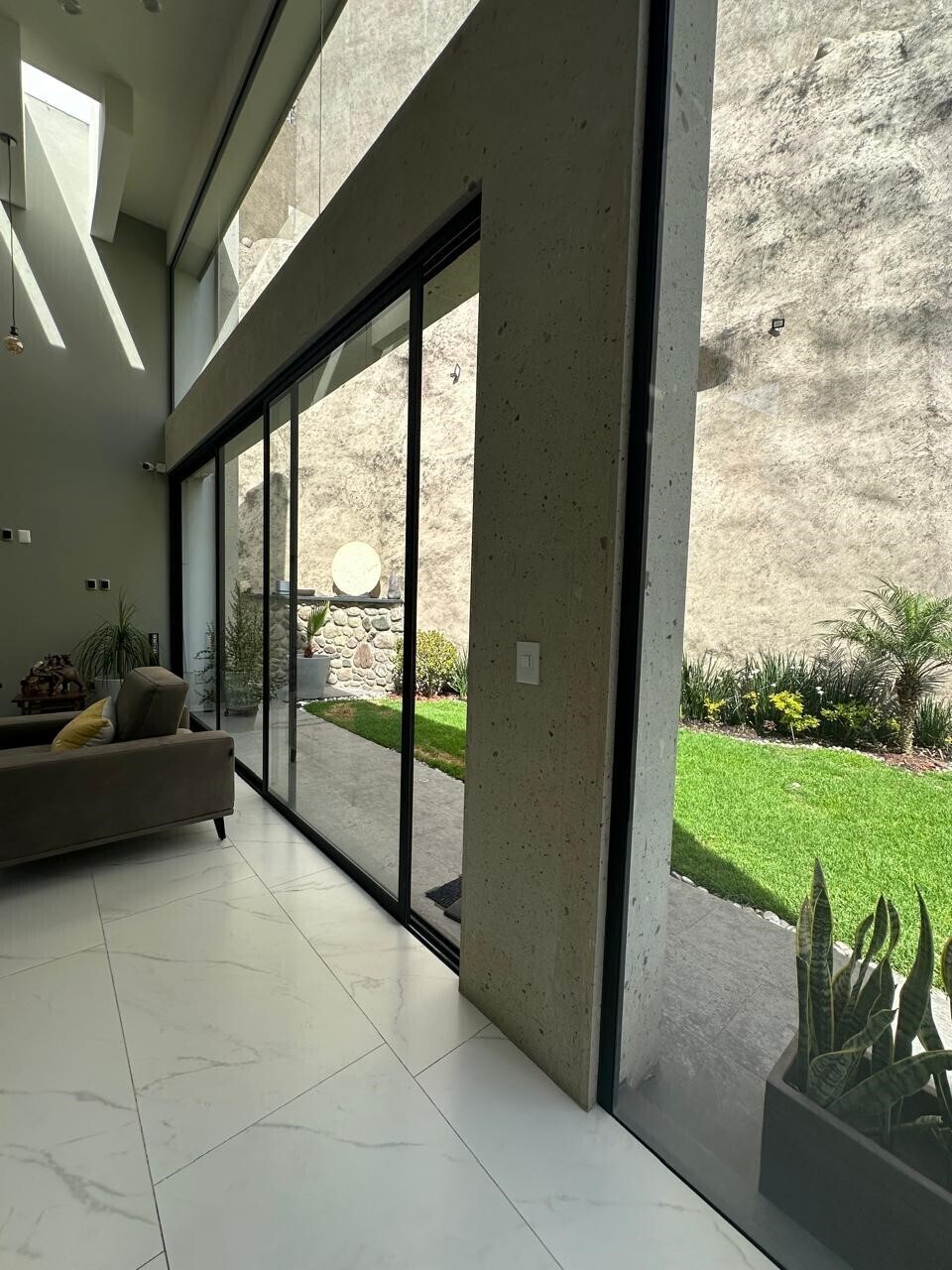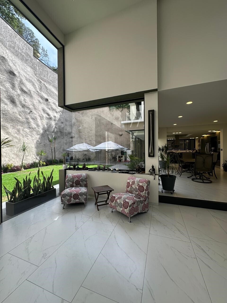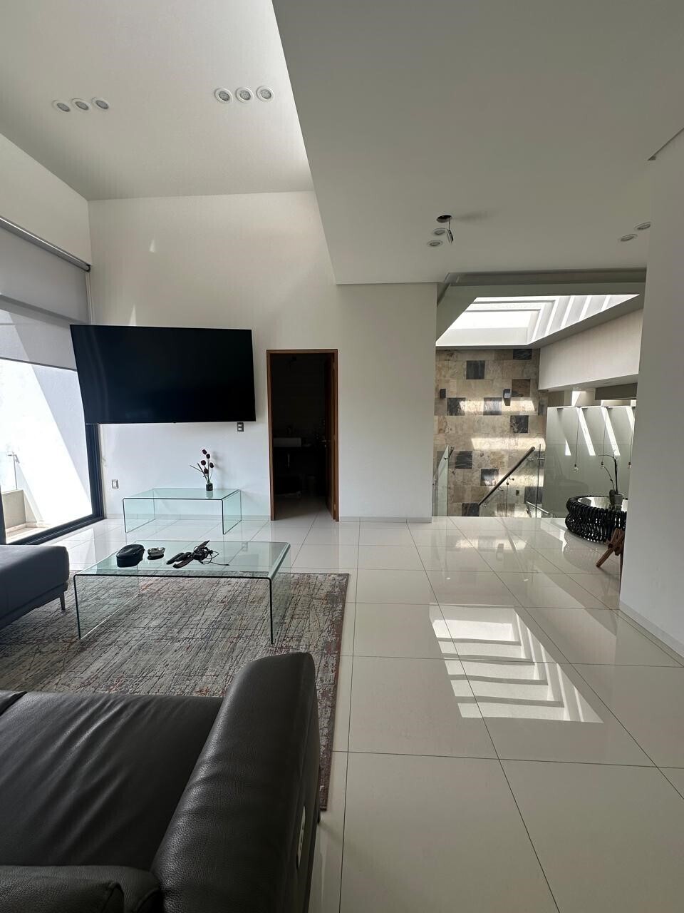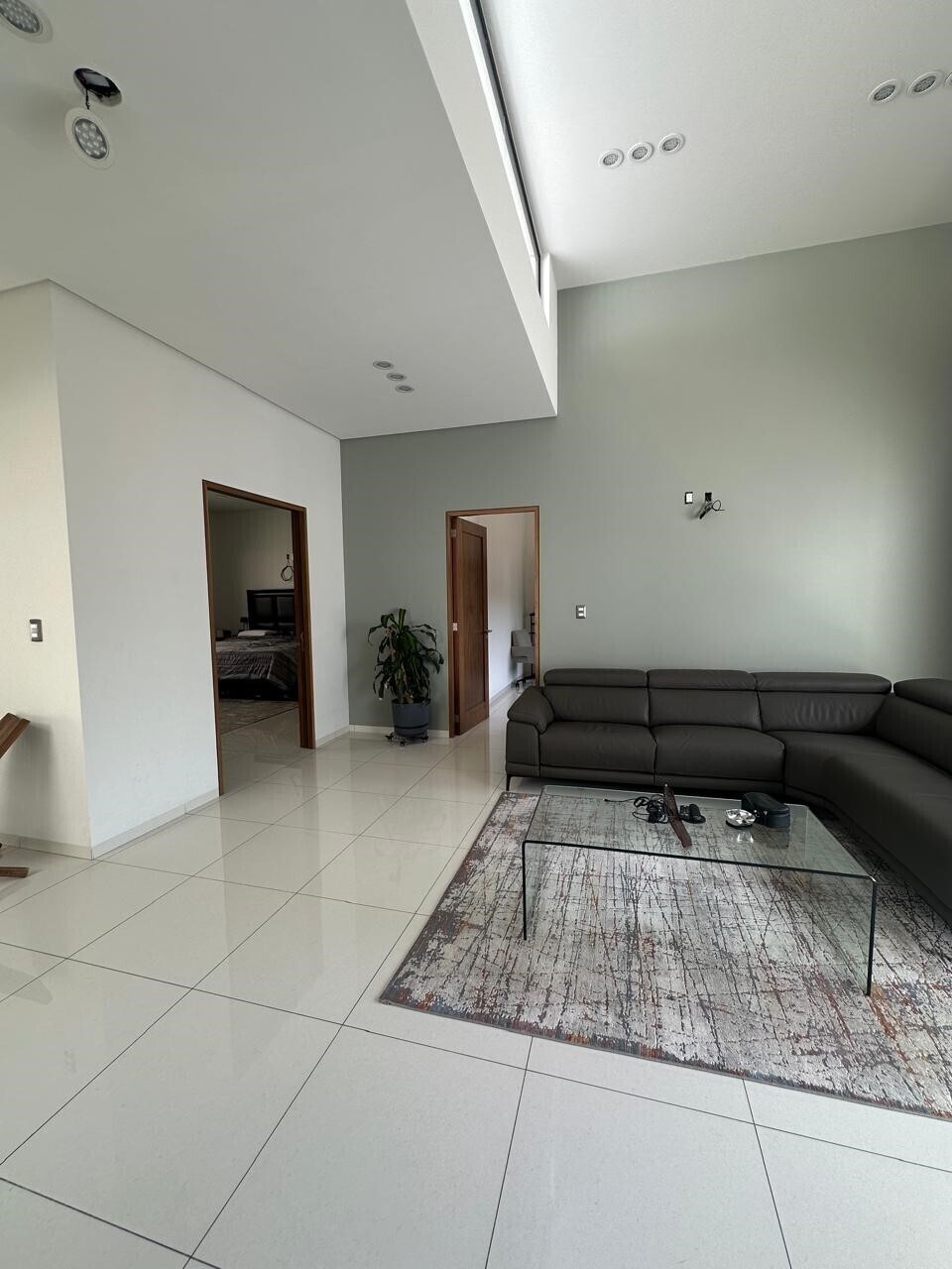 Double-height ceilings in the living room, kitchen, and staircase.