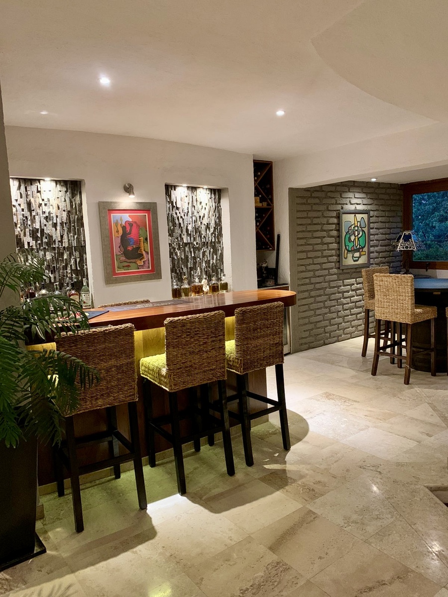 Planta Principal: Entrada Principal, Estacionamiento cubierto 4 autos, Vestíbulo, Bar, 1/2