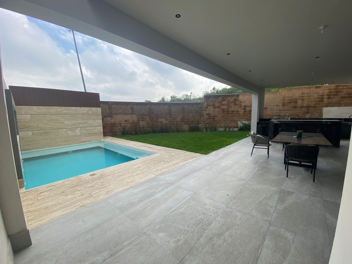 🔹Terraza con barra y asador, puertas de aluminio, tarja, muebles de jardín, medio baño decorado, segunda barra de cuarzo con sillas, pantalla, amplio jardín y alberca con calefacción.