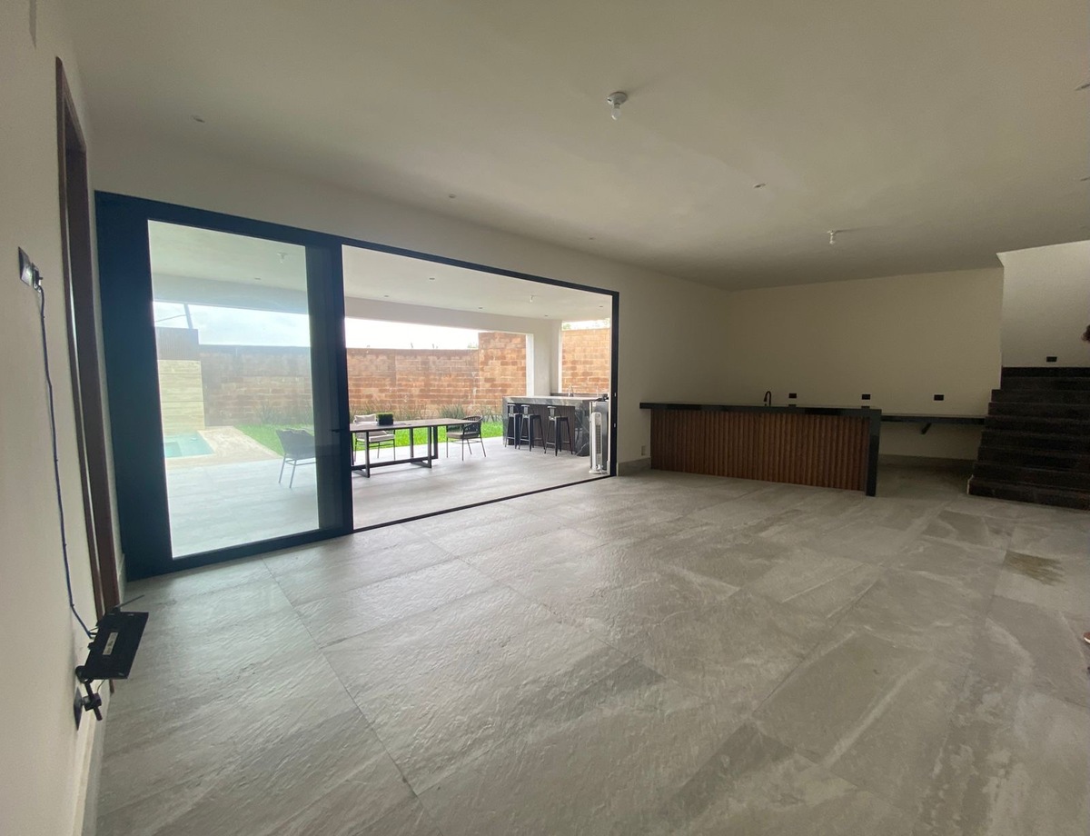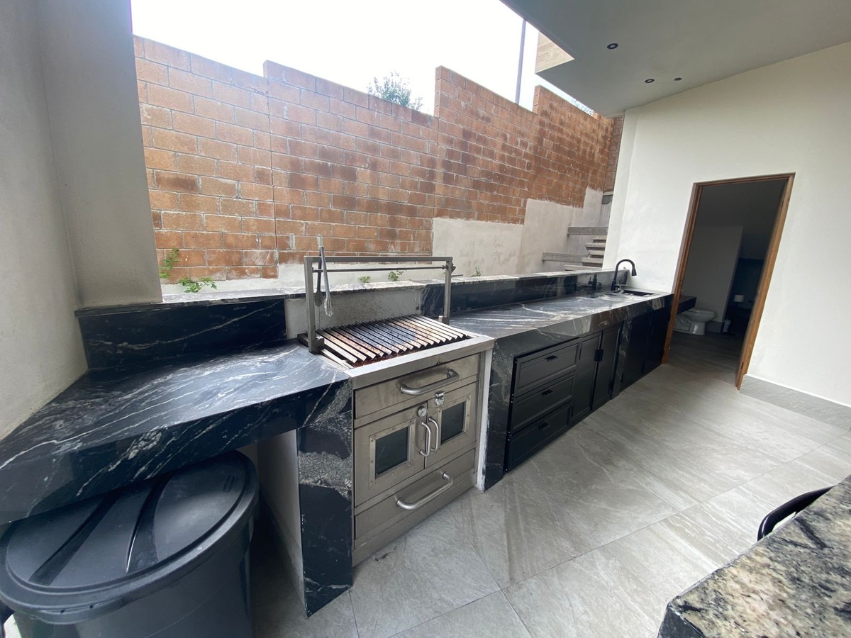 Cochera para 3 vehículos. La casa cuenta con 3.40 m de altura. Sala con ventanales que permiten entrada de luz natural, decoración moderna de madera en techo. Comedor amplio con cortinas. Cocina de cuarzo totalmente equipada, con refrigerador duplex, parrilla, alacenas, barra desayunadora con sillas. Decorada con lambrin.
