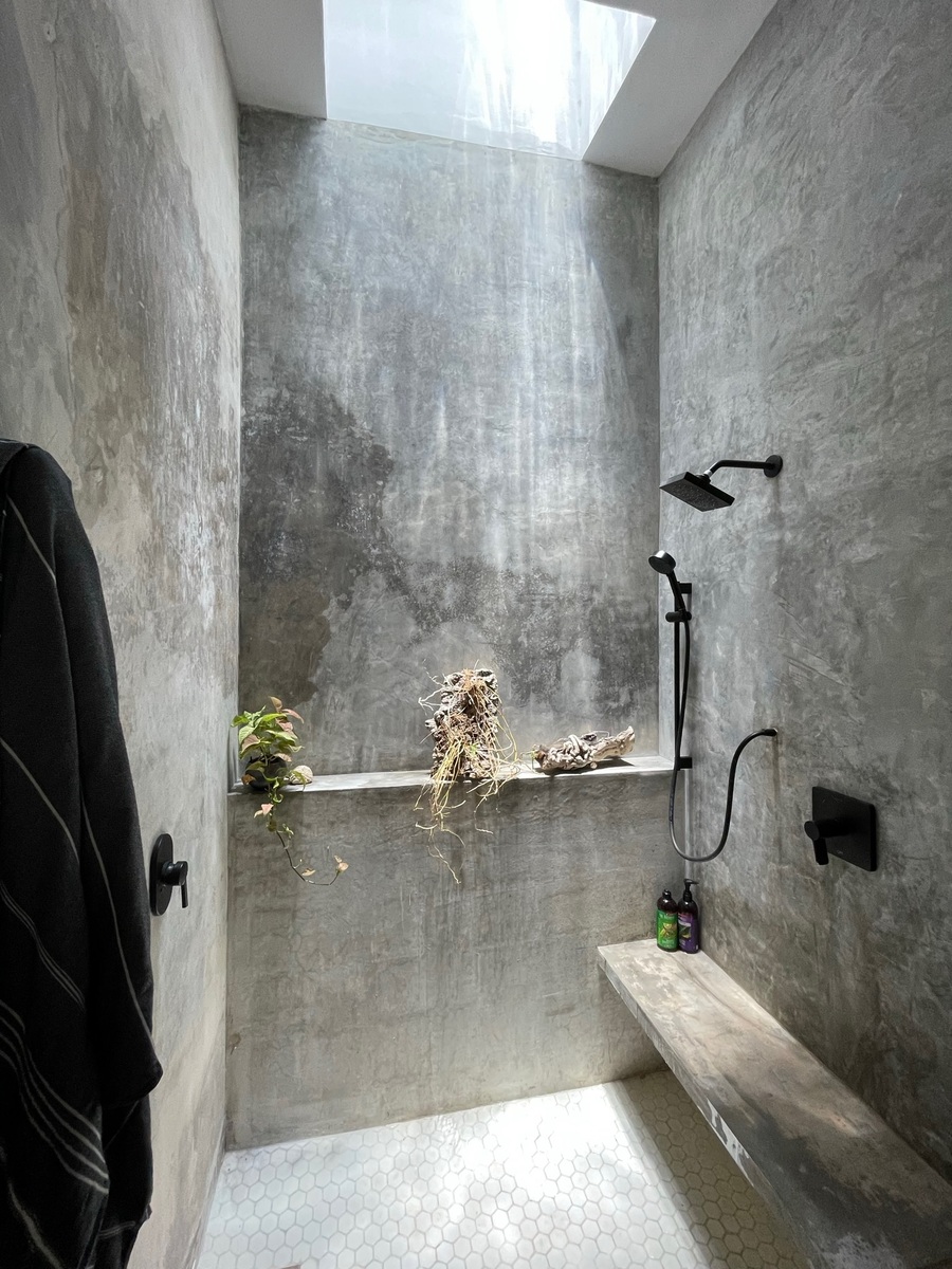Piscina con cascada con baño y ducha al aire libre