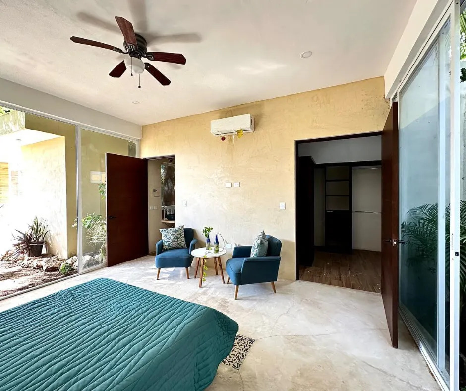 Consta de: Habitación principal con baño completo, closet vestidor, dos jardines interiores, vista a la terraza, aire acondicionado y ventilador.