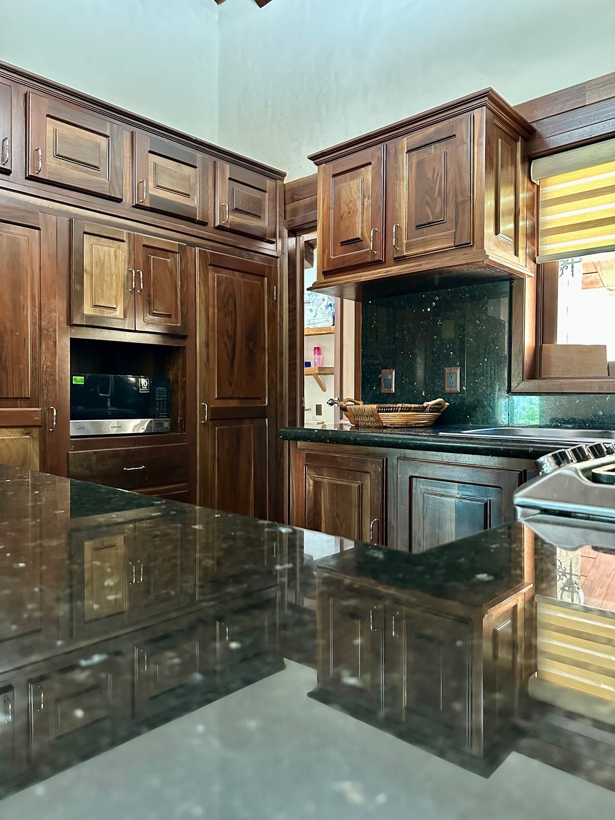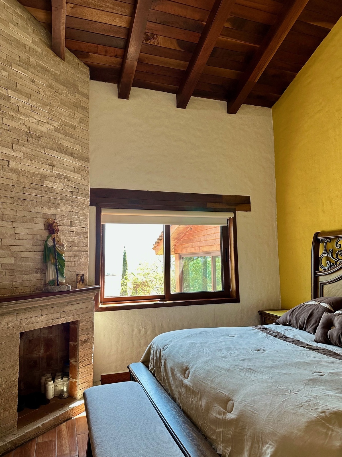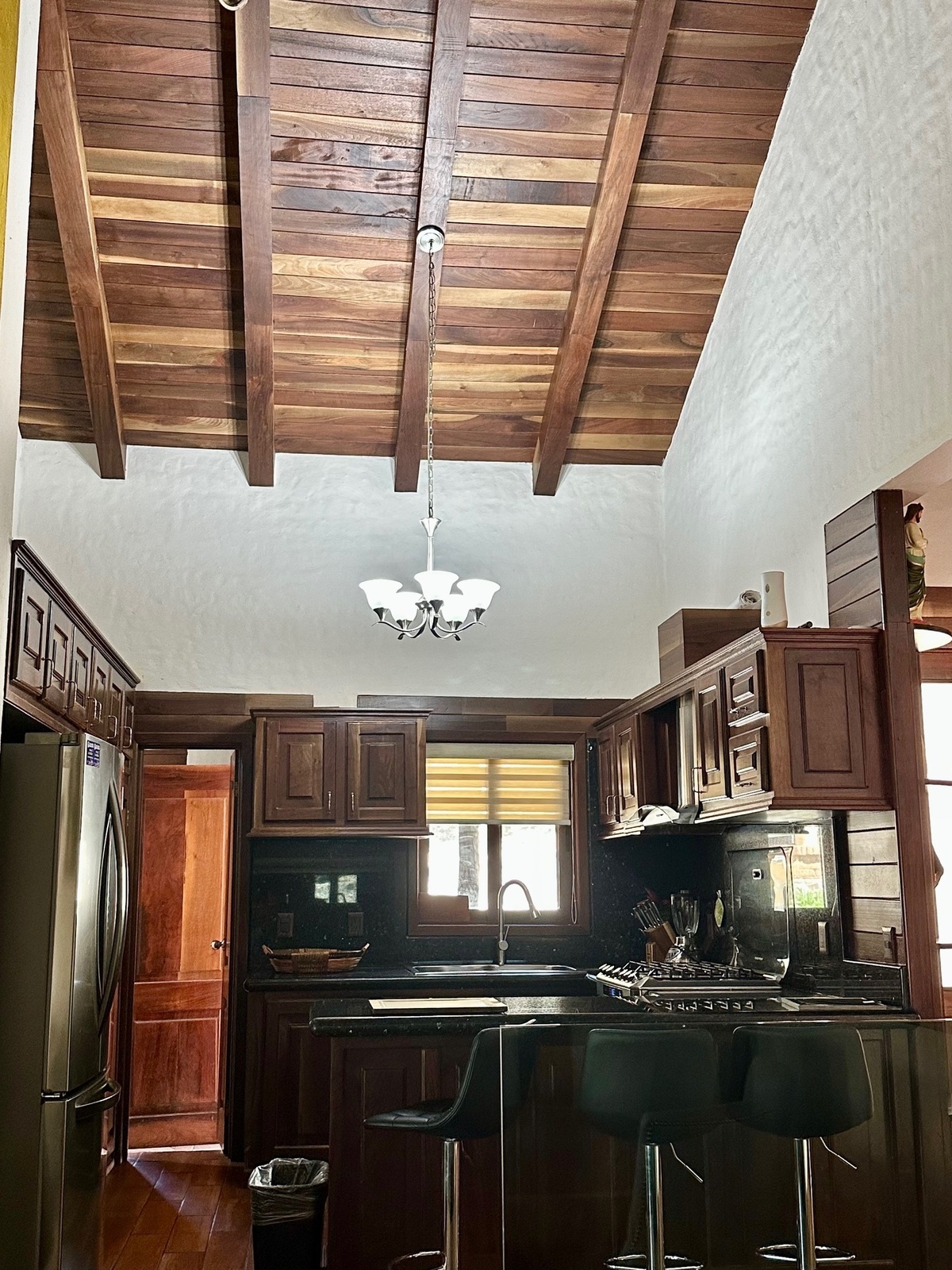 Cocina integral equipada, tres chimeneas: en sala, terraza y recamara principal.