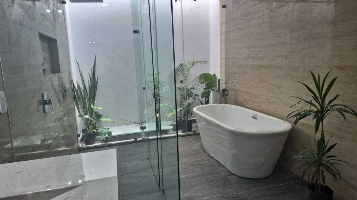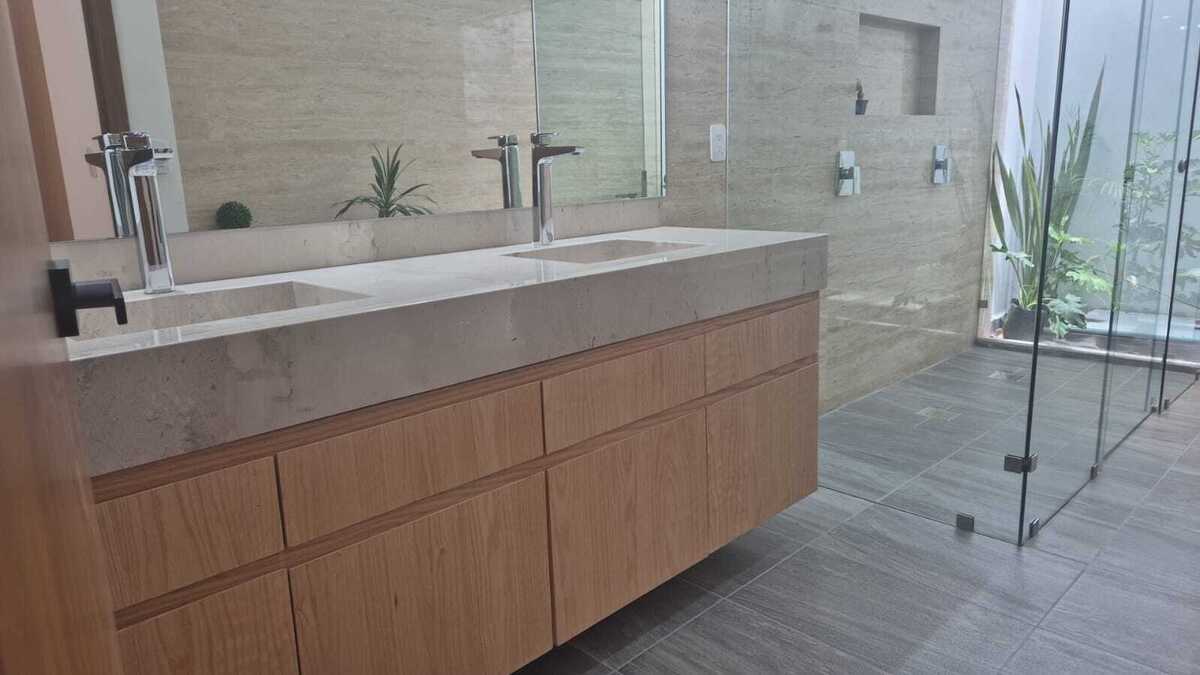 FINA CARPINTERIA, ACABADOS EN MÁRMOL BLANCO VENECIANO EN GRAN FORMATO, CRISTAL TEMPLADO, PLAFONES EN TECHO CON ILUMINACIÓN LED, CHAPA PRINCIPAL INTELIGENTE, GRIFERÍA HELVEX.