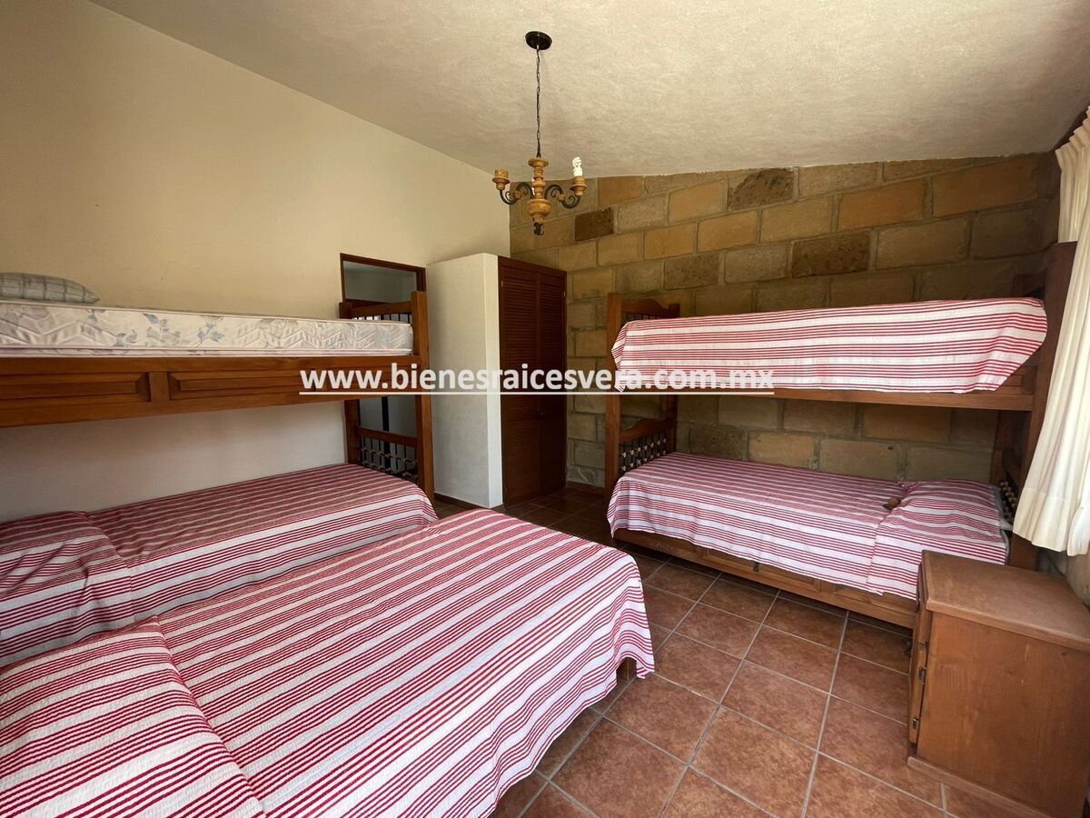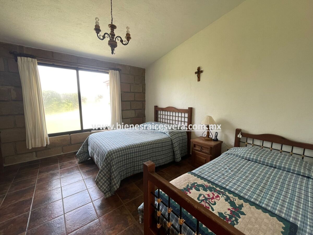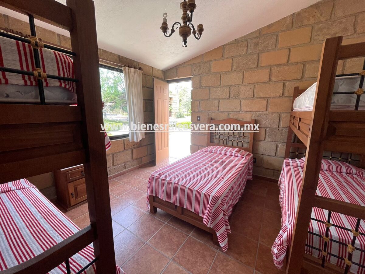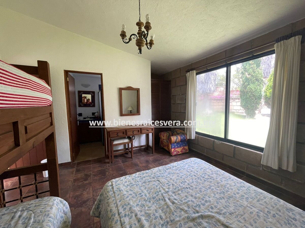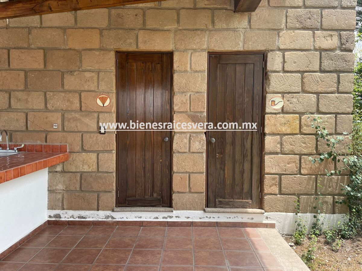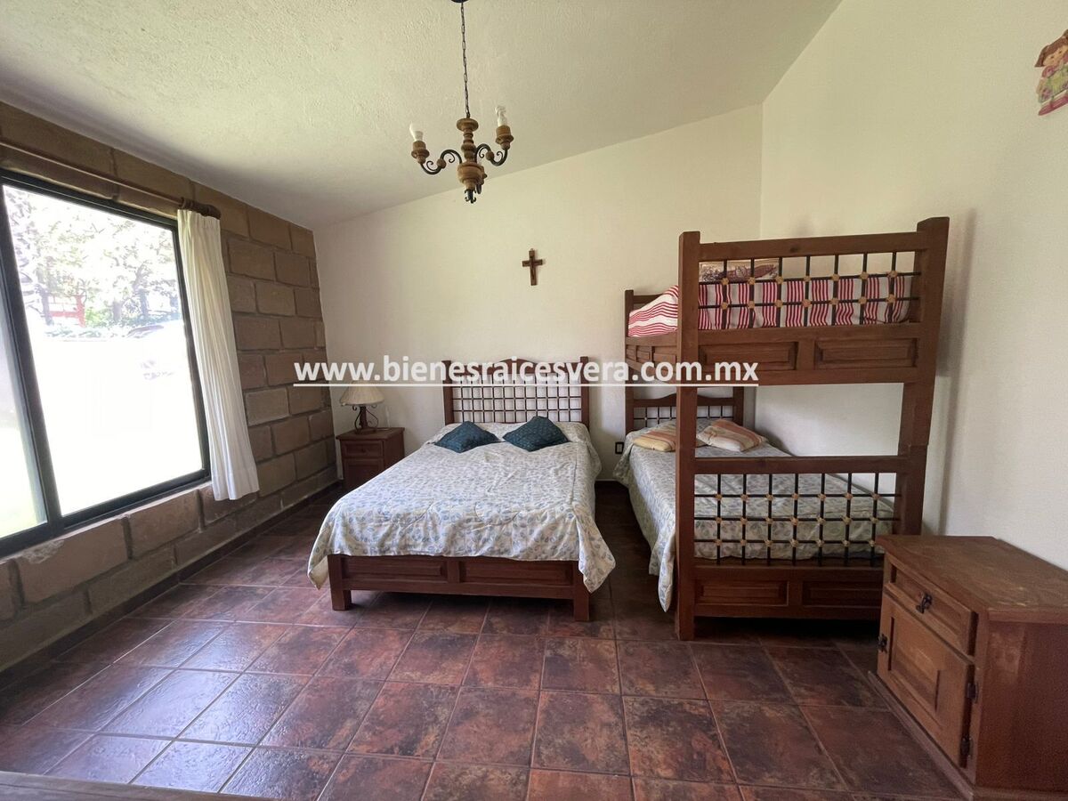 La casa principal cuenta con tres recamaras con baño cada una y closets. sala con chimenea, comedor, cocina equipada, medio baño de visitas, sala de t.v , cuarto de lavado y terraza, frente a ella una hermosa fuente de piedra que da una sensación de tranquilidad con la caída de agua.