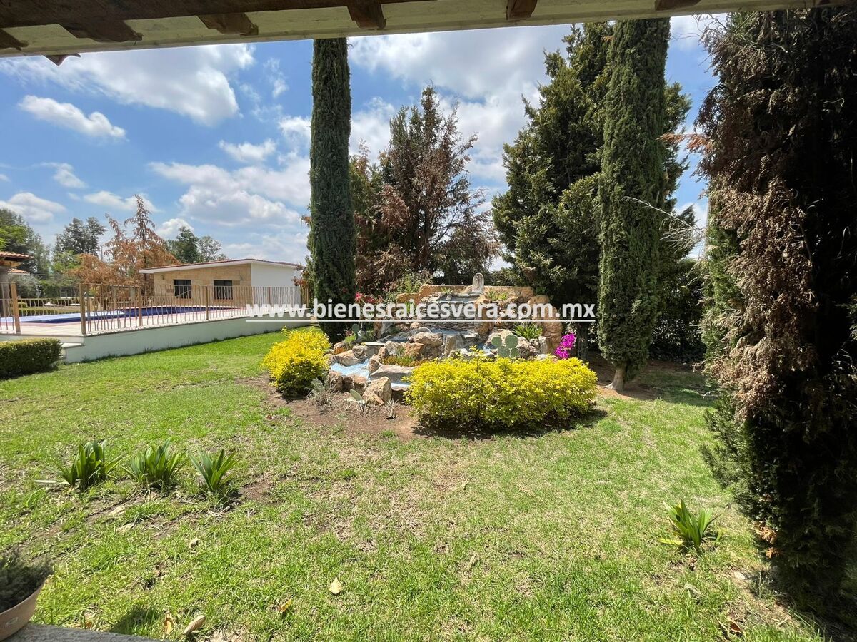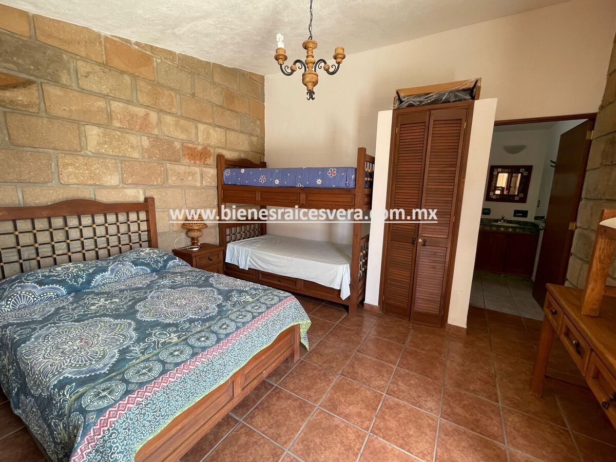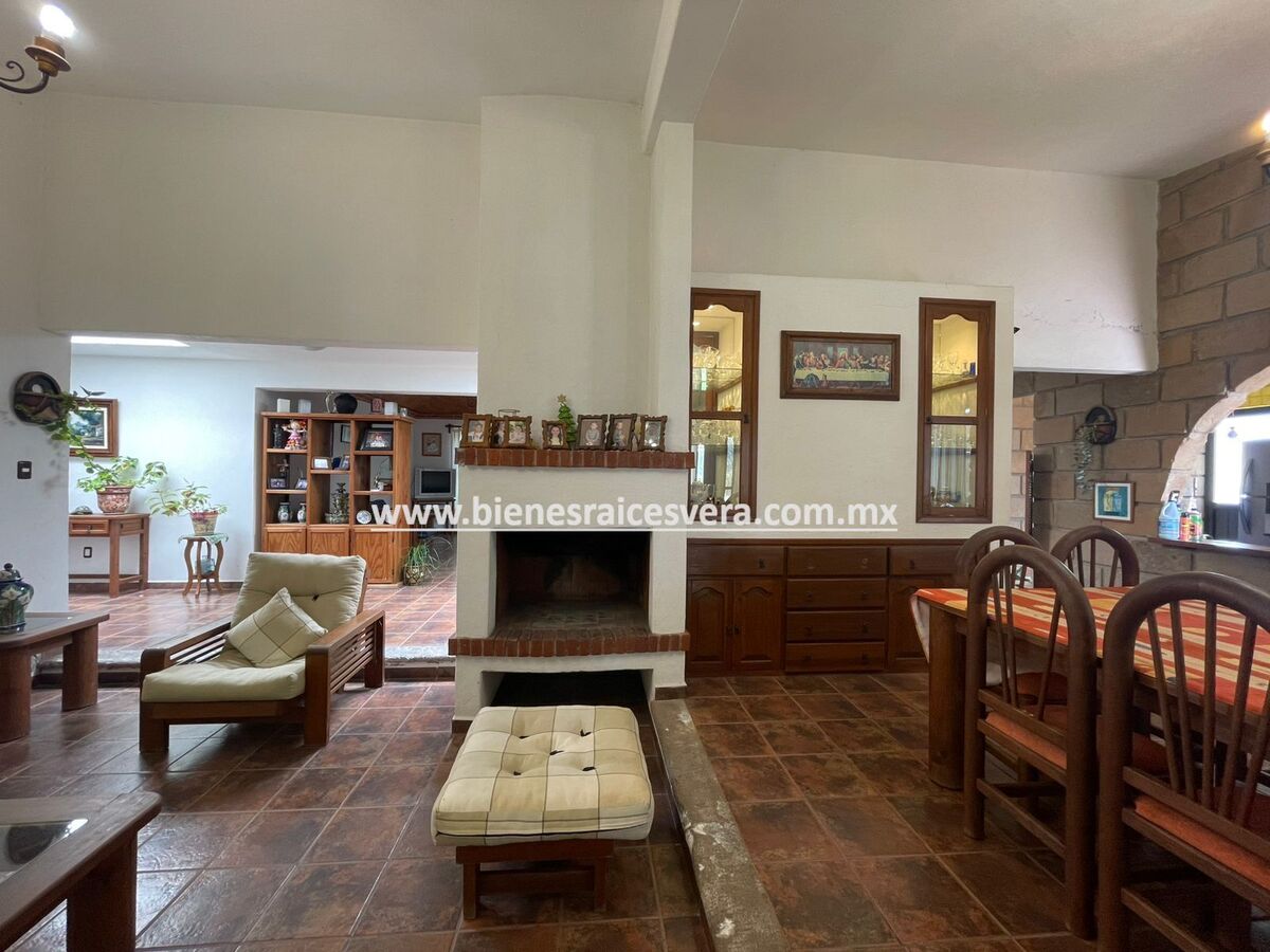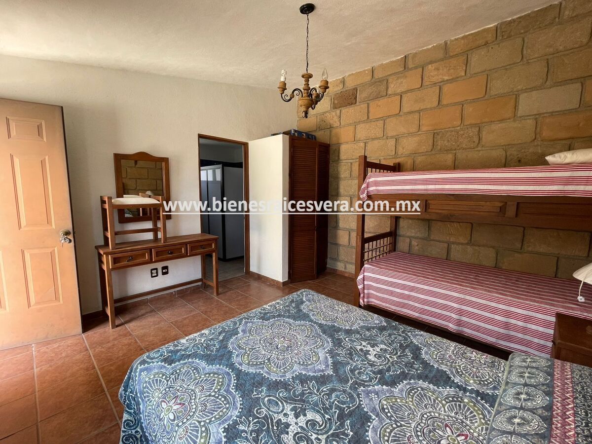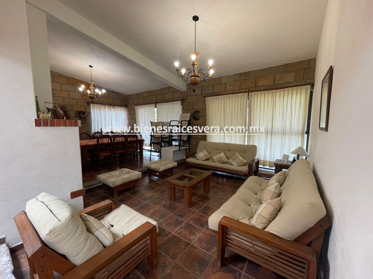 La casa principal cuenta con tres recamaras con baño cada una y closets. sala con chimenea, comedor, cocina equipada, medio baño de visitas, sala de t.v , cuarto de lavado y terraza, frente a ella una hermosa fuente de piedra que da una sensación de tranquilidad con la caída de agua.