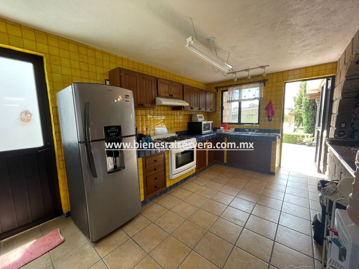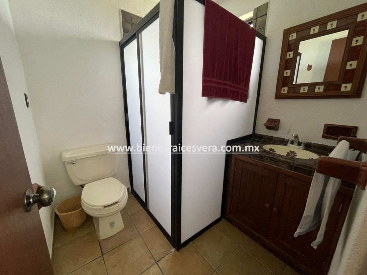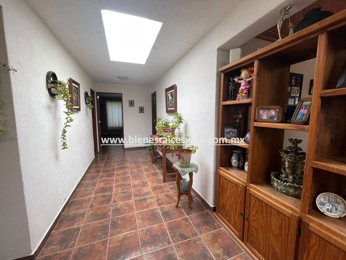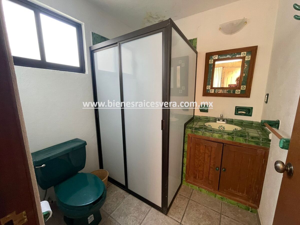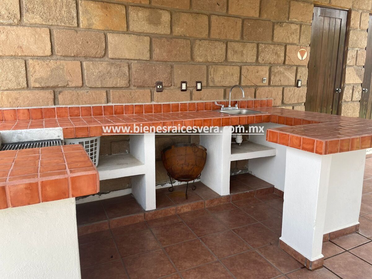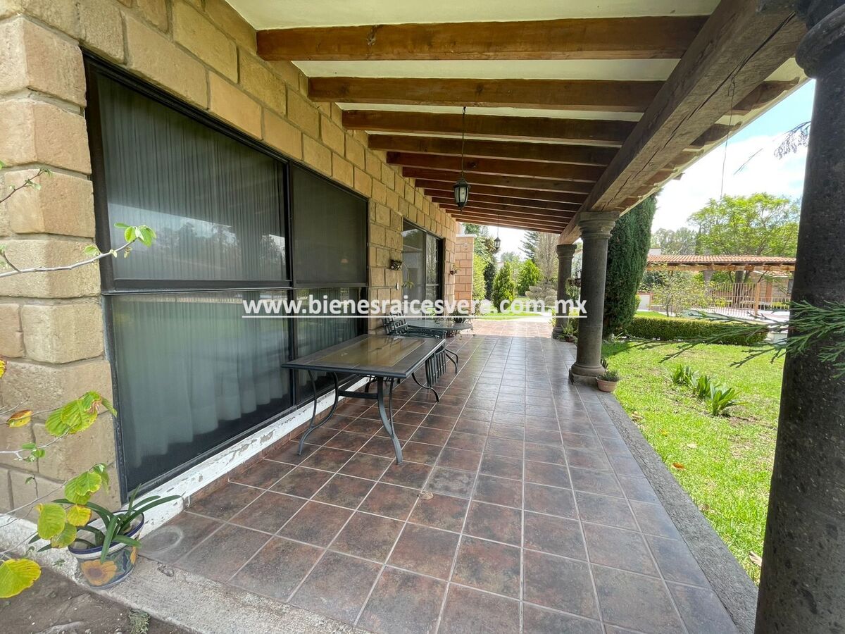 La casa principal cuenta con tres recamaras con baño cada una y closets. sala con chimenea, comedor, cocina equipada, medio baño de visitas, sala de t.v , cuarto de lavado y terraza, frente a ella una hermosa fuente de piedra que da una sensación de tranquilidad con la caída de agua.