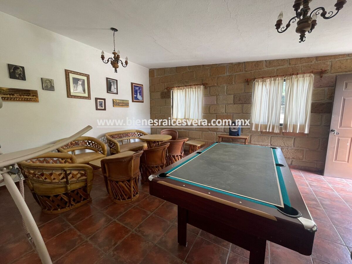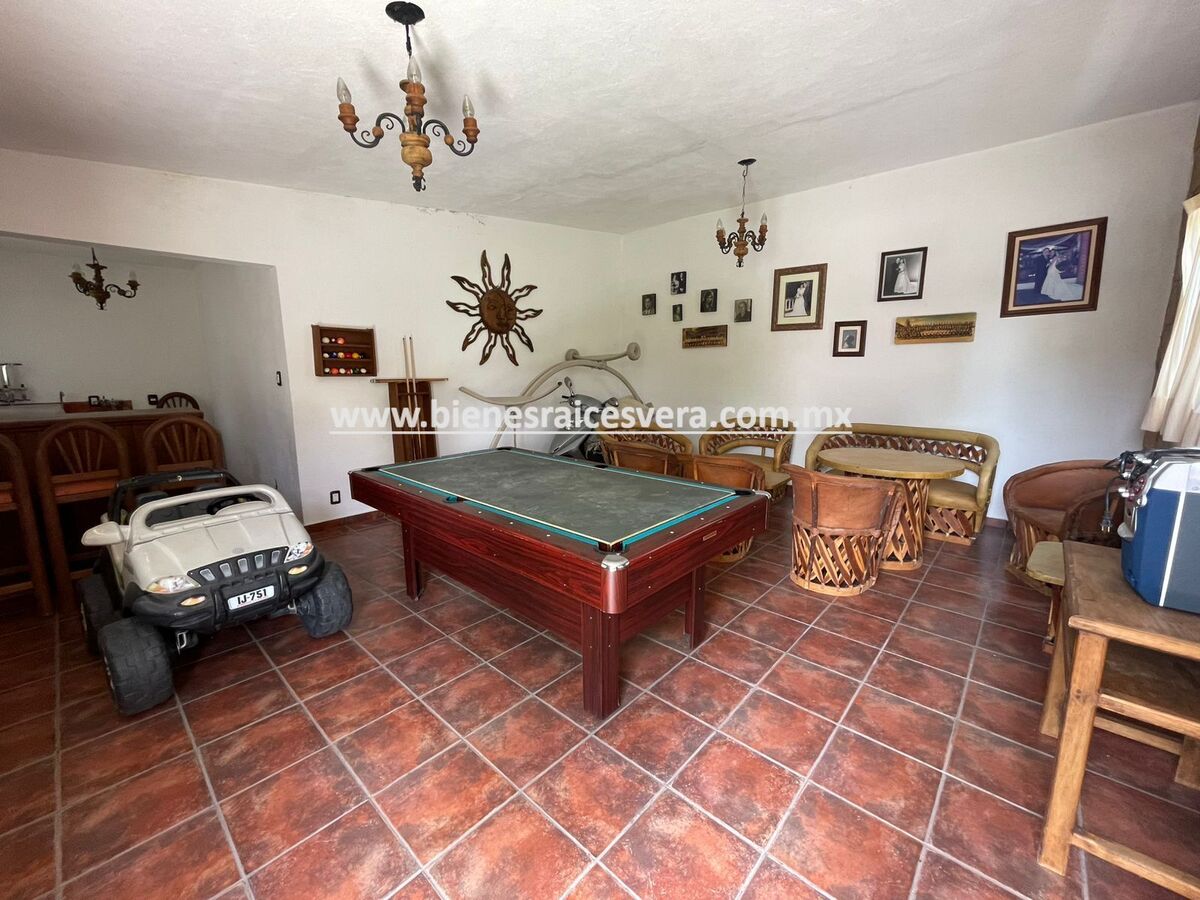 Hermosos jardines, alberca equipada con chapoteadero y jacuzzi, amplia palapa con asador y dos medios baños que dan servicio al área social del jardín, salón de juegos con barra y tarja.