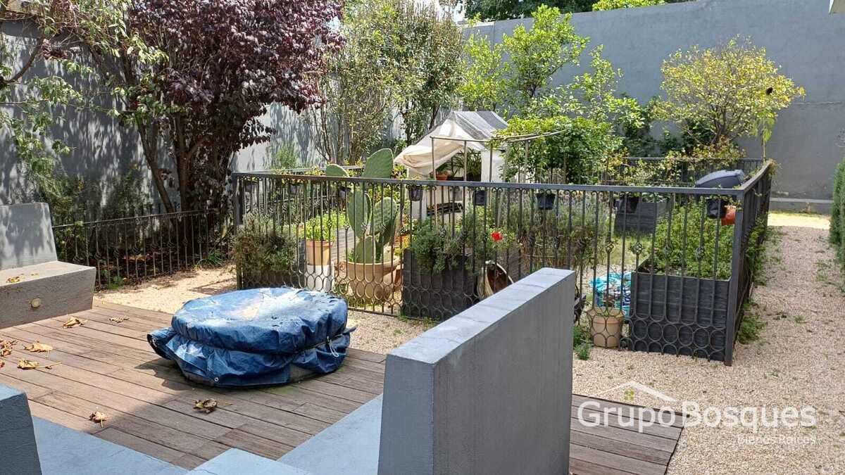 The entrance from the street opens the doors to an impeccable garden with an outdoor pool and at the back a covered space with grills and a study that can also serve for events with access to the garden and grills.
