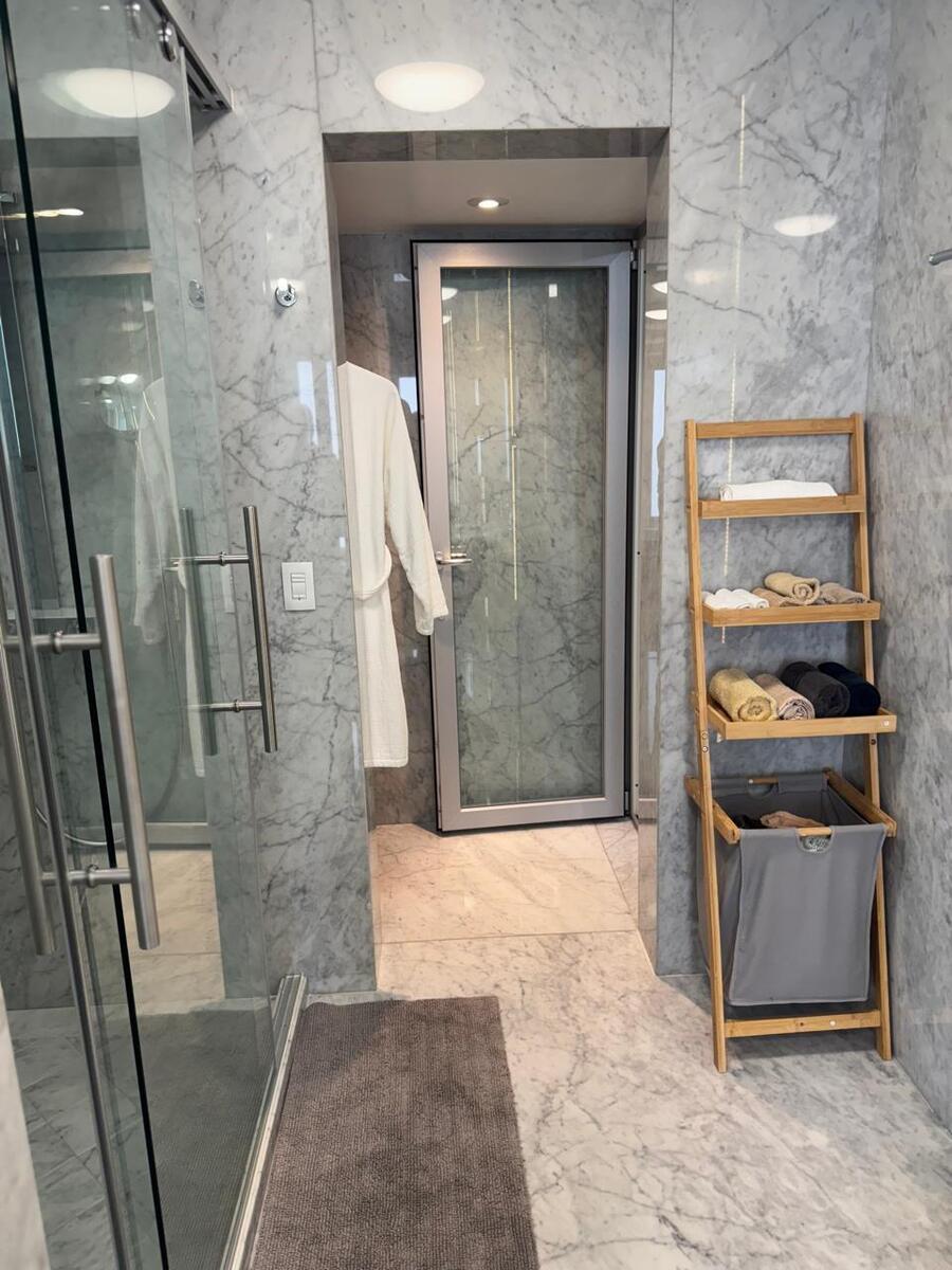 Starting with the service area, it has a very spacious parking lot from where access is granted to the different storage rooms, machine room, surveillance area, and a wine cellar implemented with great detail. In the backyard, there is a garden and space for games like basketball or soccer. Gym with bathroom and steam included, with luxury finishes. It has a whole service area, with 2 rooms for staff, bathrooms, a small living room, and kitchenette.