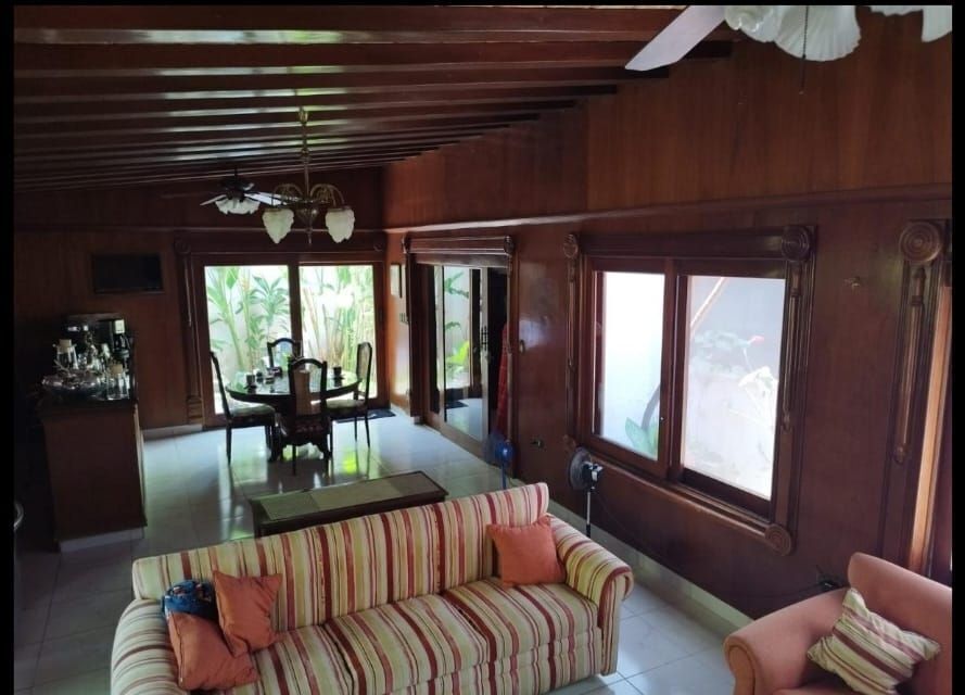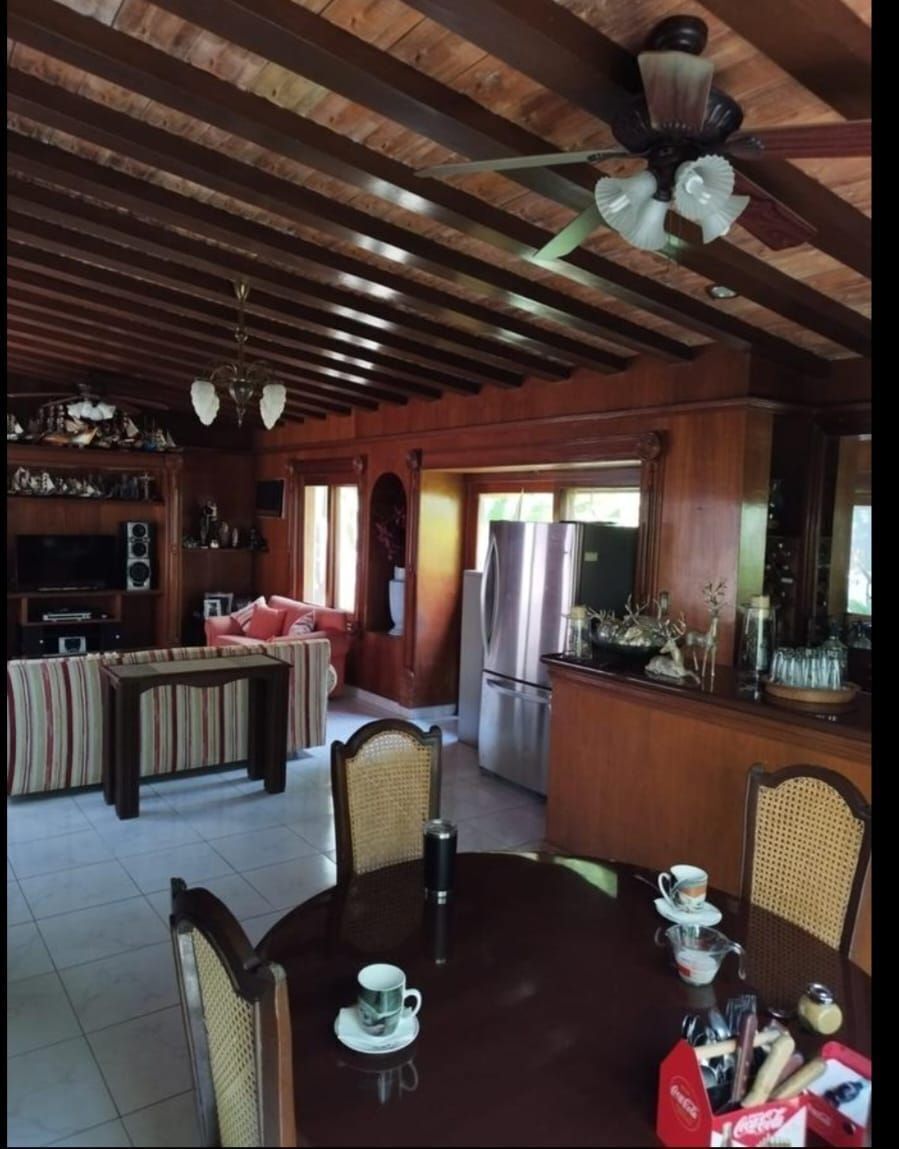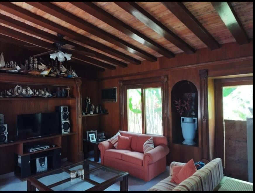 Estudio/Family Room/Salón de juegos o Cuarto de T.V. con área Bar, (con bellos acabados en toda la habitación y barra, todo en madera incluye vigas del mismo material y tejas francesas), con vista y salidas al jardín y patio trasero.
