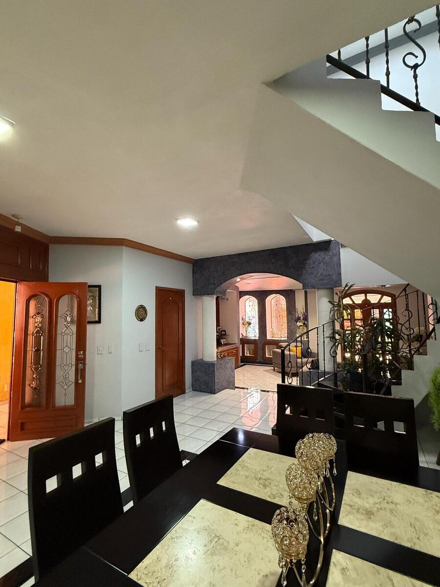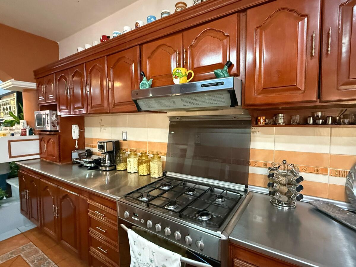 You enter a spacious distributor that leads to a spiral staircase with glass panels next to the dining room, a living room with stained glass windows that allow light to enter the social area. The kitchen is equipped with solid wood cabinetry, stainless steel countertops, a double sink, and a space for a breakfast nook. On this level, there is also a half bathroom and the terrace.