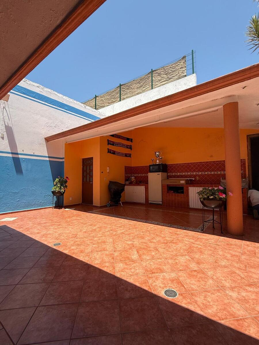 Se puede acceder a la terraza desde la estancia o bien por el ingreso lateral de la propiedad que conecta con la cochera semicubierta. El área techada se compone de un techo a dos aguas, cocineta con tarja y espacio para asador, un muro llorón totalmente funcional recubierto de piedra volcánica negra. Medio baño adicional para uso en reuniones.