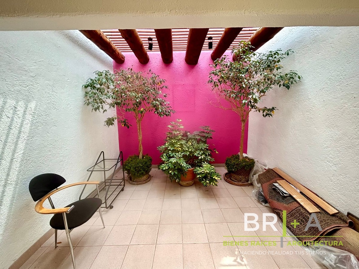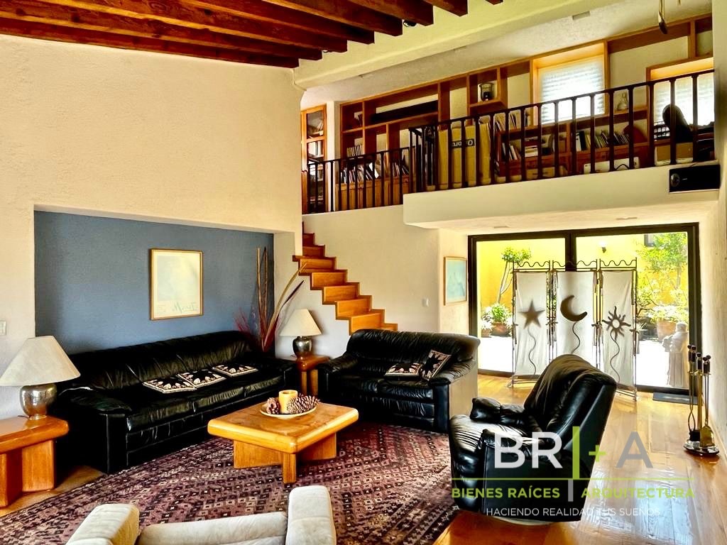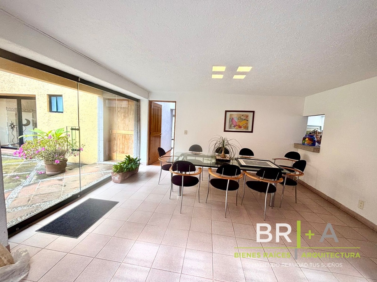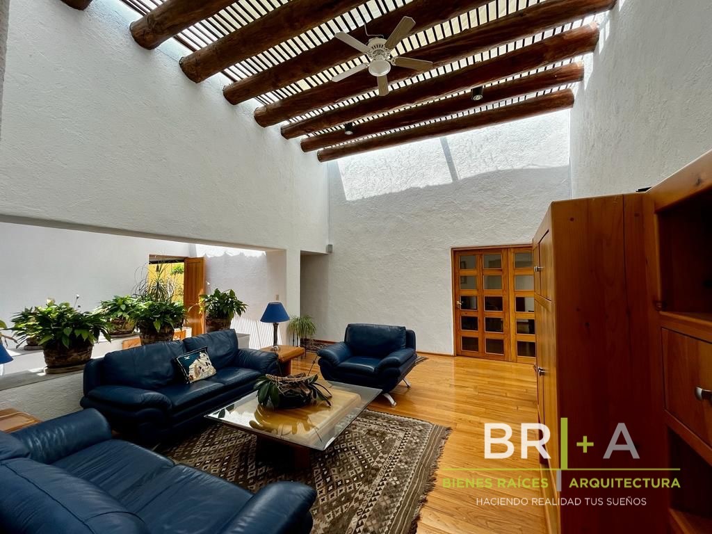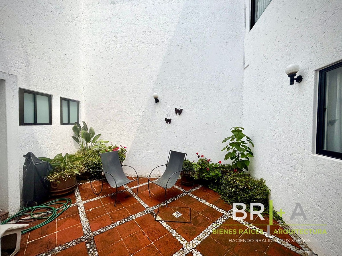 - Sala con chimenea conectada con la plazuela exterior (dentro de la casa) lo que permite extender las reuniones al aire libre.