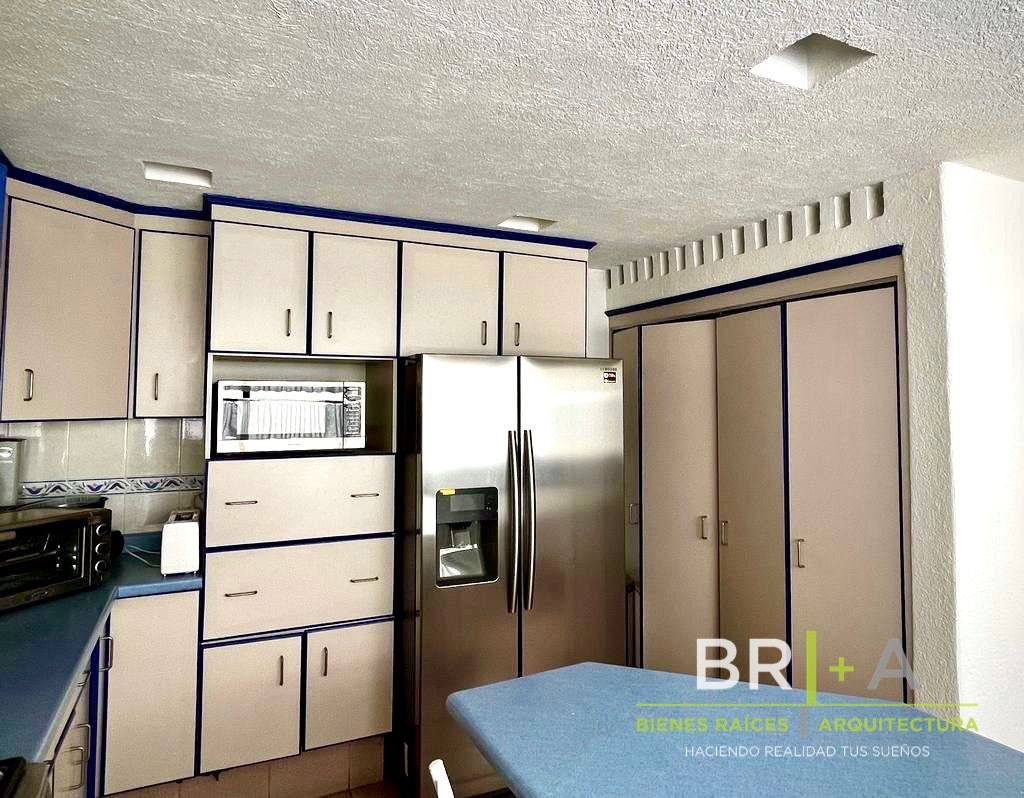 -Área de servicio para buffet con barras que conectan con la cocina con amplia despensa y varios espacios para guardar, doble tarja, barra central, espacio para refrigerador, microondas, lavaplatos, estufa con horno, puertas para área de lavado (lavadora y secadora y fregadero).