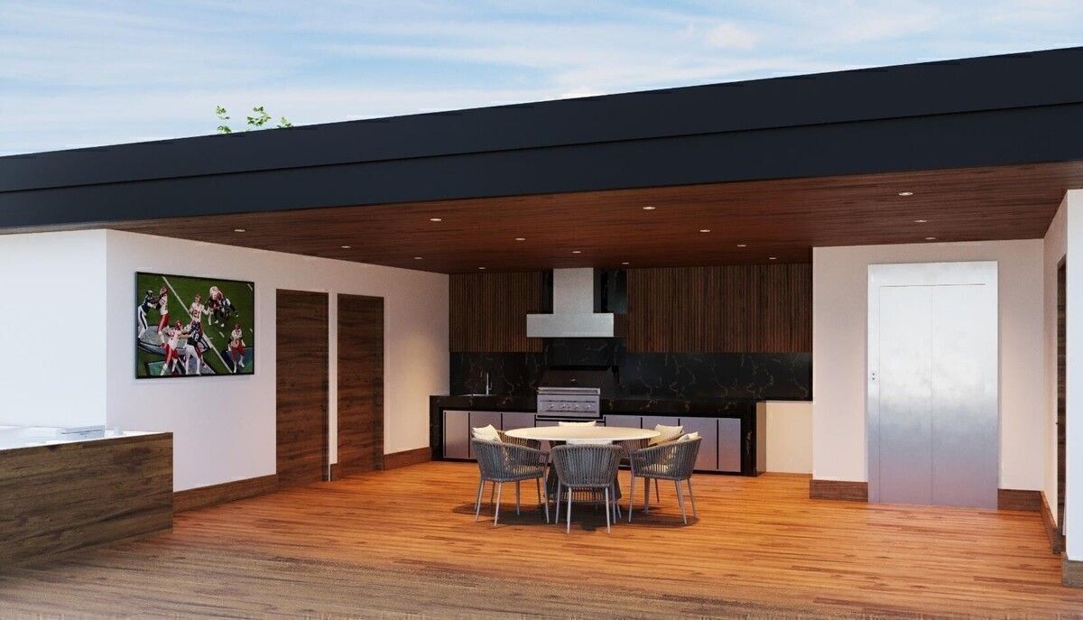 ✔ Luxury rooftop: Covered social area with panoramic views, bar with sink, grill, and full bathroom.