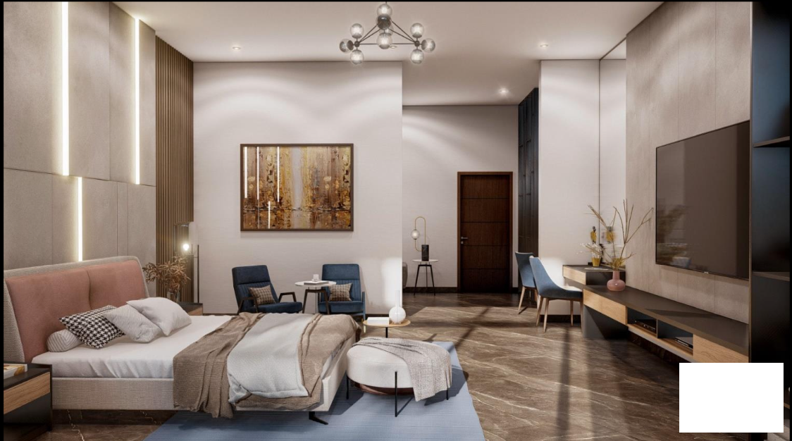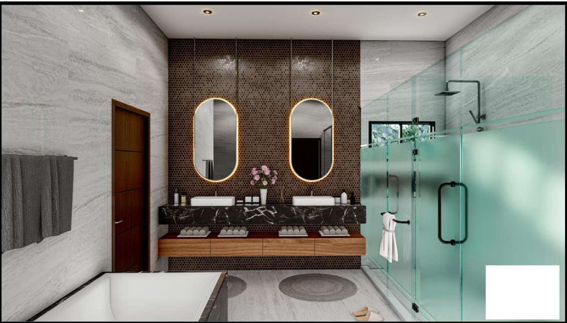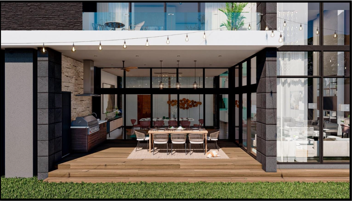 Cochera para 4 autos, acceso principal y doble altura en sala y bar, comedor, cocina integral con family room, despensa, baño completo de visitas, sala de cine/estudio/oficina, opción a cuarta recámara, terraza techada con barra cubierta de granito con tarja y preparación de asador, jardín exterior con baño completo, pasillo de servicio, lavandería, cuarto de servicio con baño completo, cuarto de máquinas, nicho de boilers y alberca. Preparación de elevador.