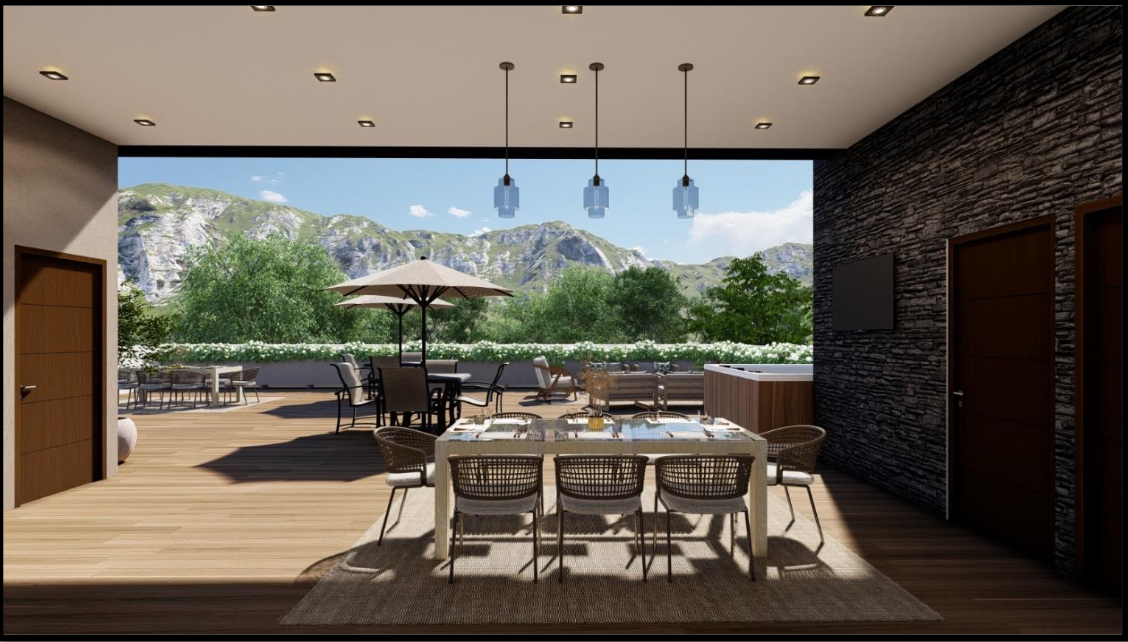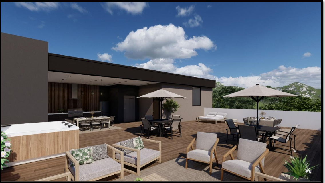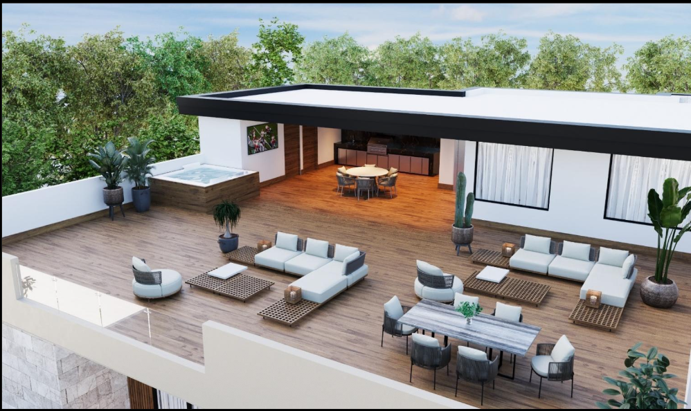 Cubo escaleras y elevador para acceso a azotea, terraza techada, baño completo, área social exterior , barra cubierta de granito con tarja y preparación de asador y refrigerador, bodega y área de máquinas (climas, paneles, voz y datos, etc.). Área social interior con medio baño.