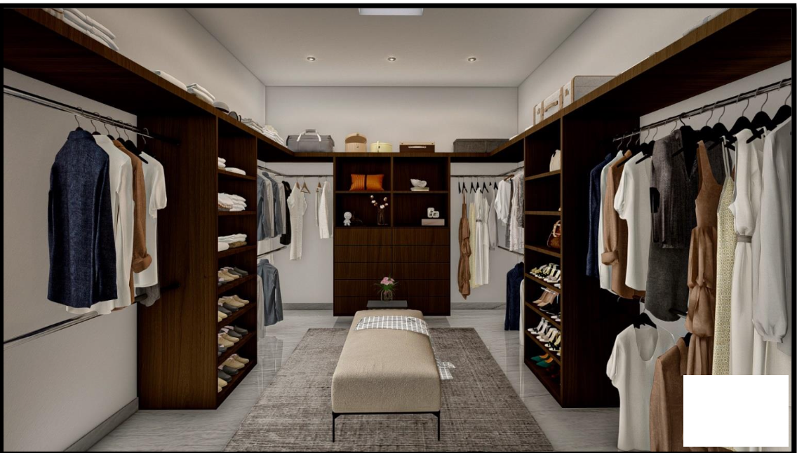4 walk-in closet con enchapado de encino (cajonera, zapatera extraíble, belicera y tubería colgante).