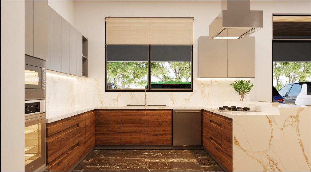 brillo, herrajes de cierre lento, cubierta de cuarzo nacional y repisas de madera en despensa (no incluye