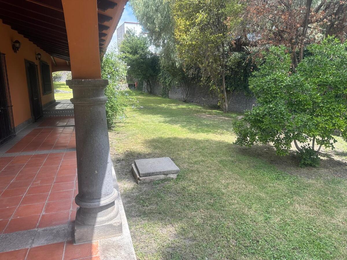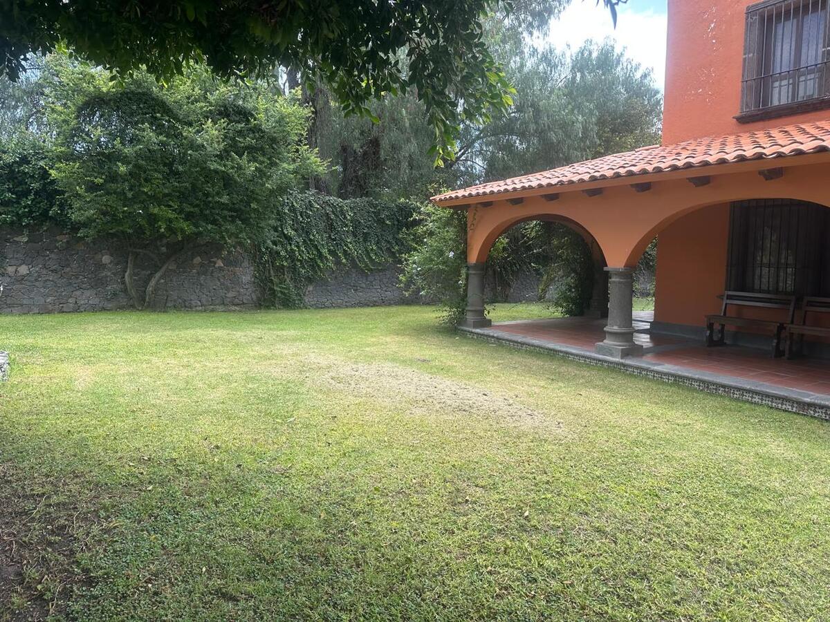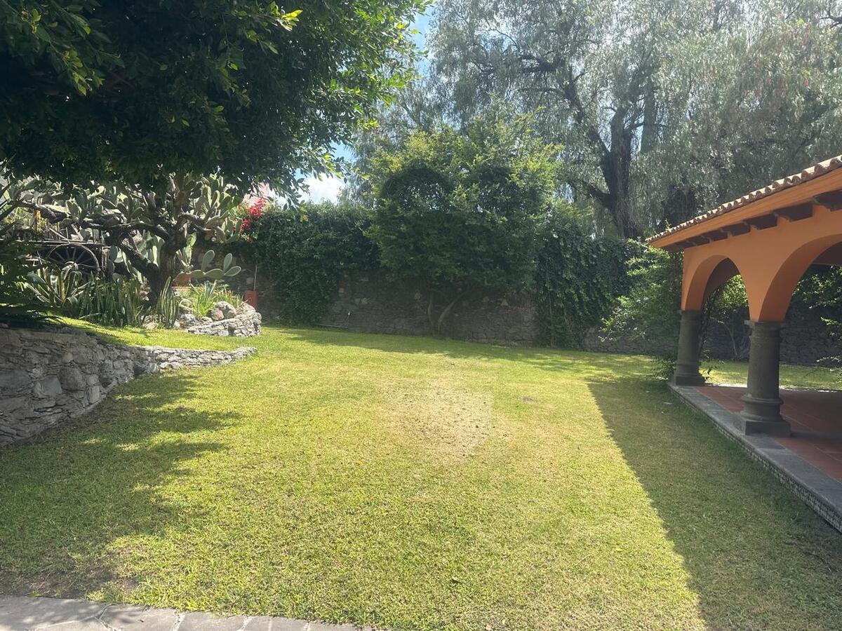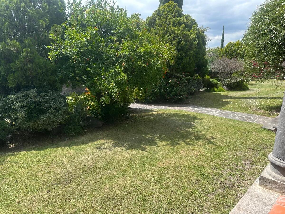 Jardín espectacular que rodea toda la casa, con huerto, alberca privada climatizada, área de asador y terrazas para disfrutar al aire libre