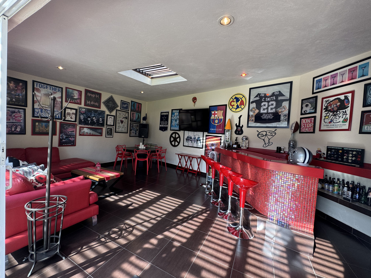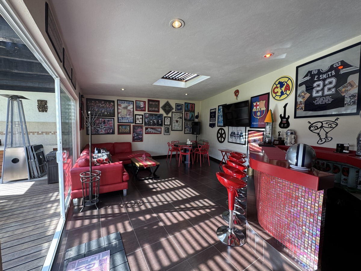 - Salón de juegos / bar cómodo y amplio con barra de madera, medio baño, cuenta con terraza con techo y área de asador.