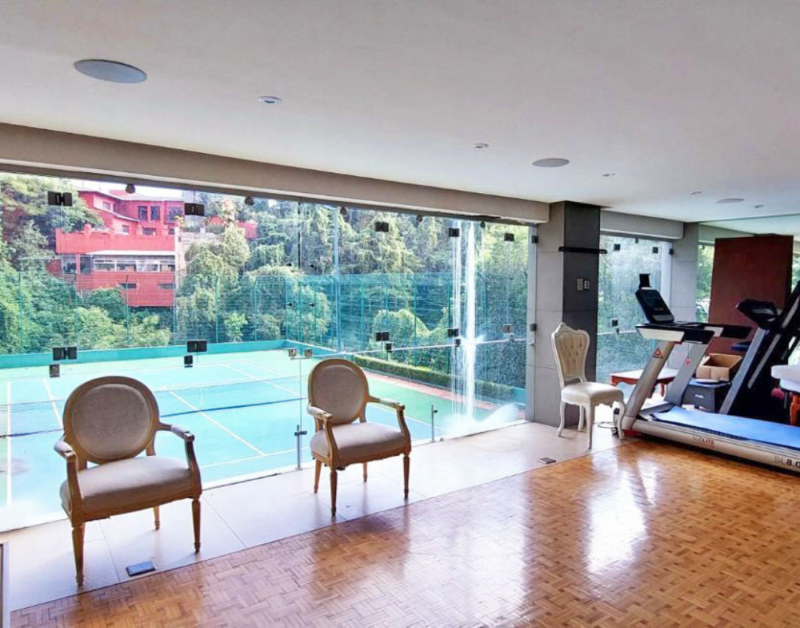 800 m2 de jardín, alberca, cancha de tenis, gimnasio, 6 cajones de estacionamiento.