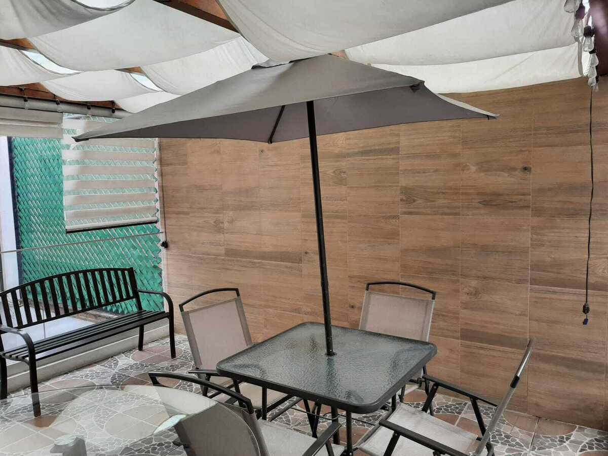 2do nivel: Recámara principal con baño completo con tina de hidromasaje, vestidor y balcón, terraza con vigas de madera.